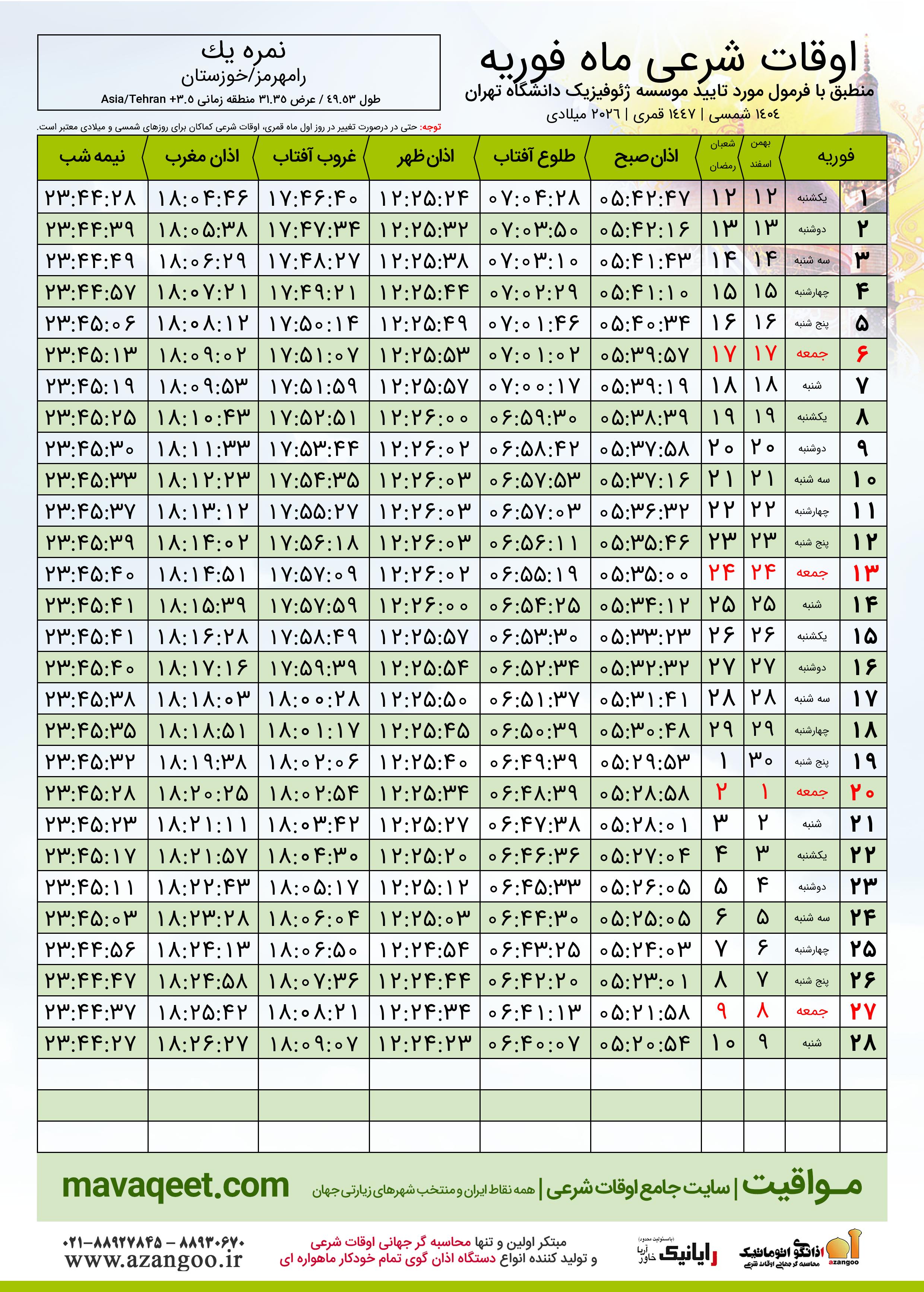 اوقات شرعی ماه رمضان شهر نمره یک ١٤٠٤ - ٠٤ شمسی | ٢٠٢٦ میلادی