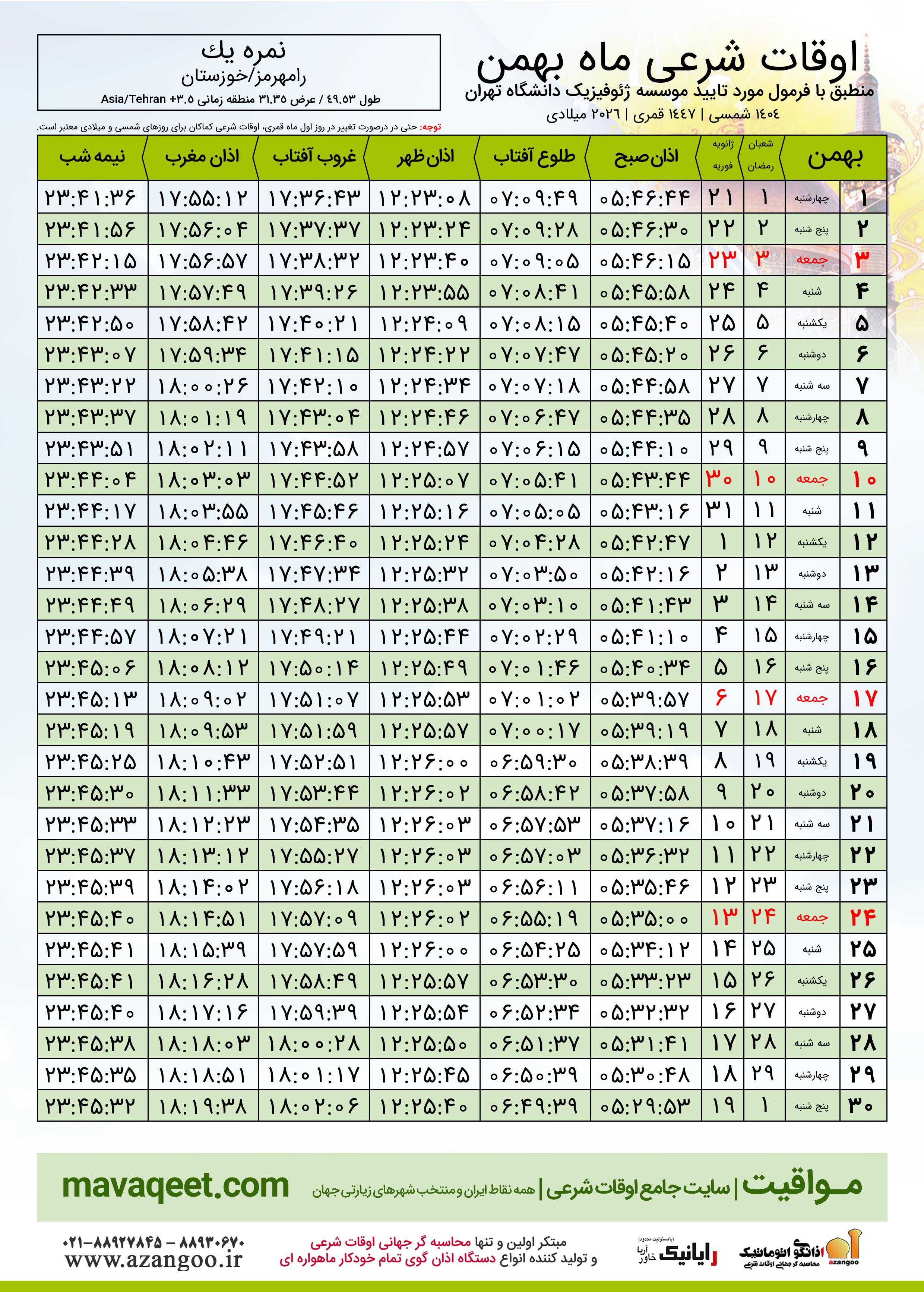 دانلود اوقات شرعی بهمن ٠٤ - ١٤٠٤ شهر نمره یک