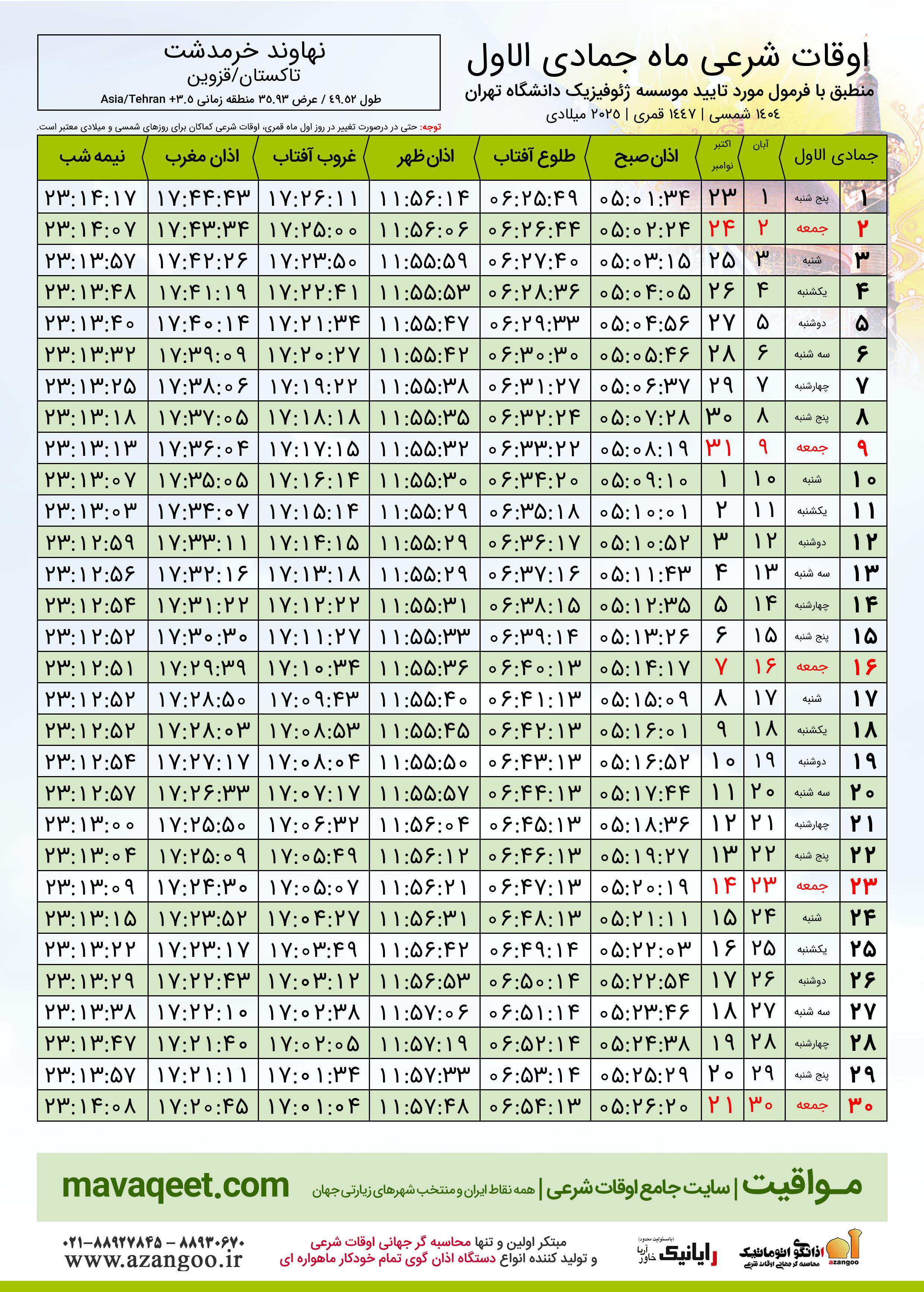 جدول اوقات شرعی جمادی الاول ١٤٤٧ قمری شهر نهاوند خرمدشت