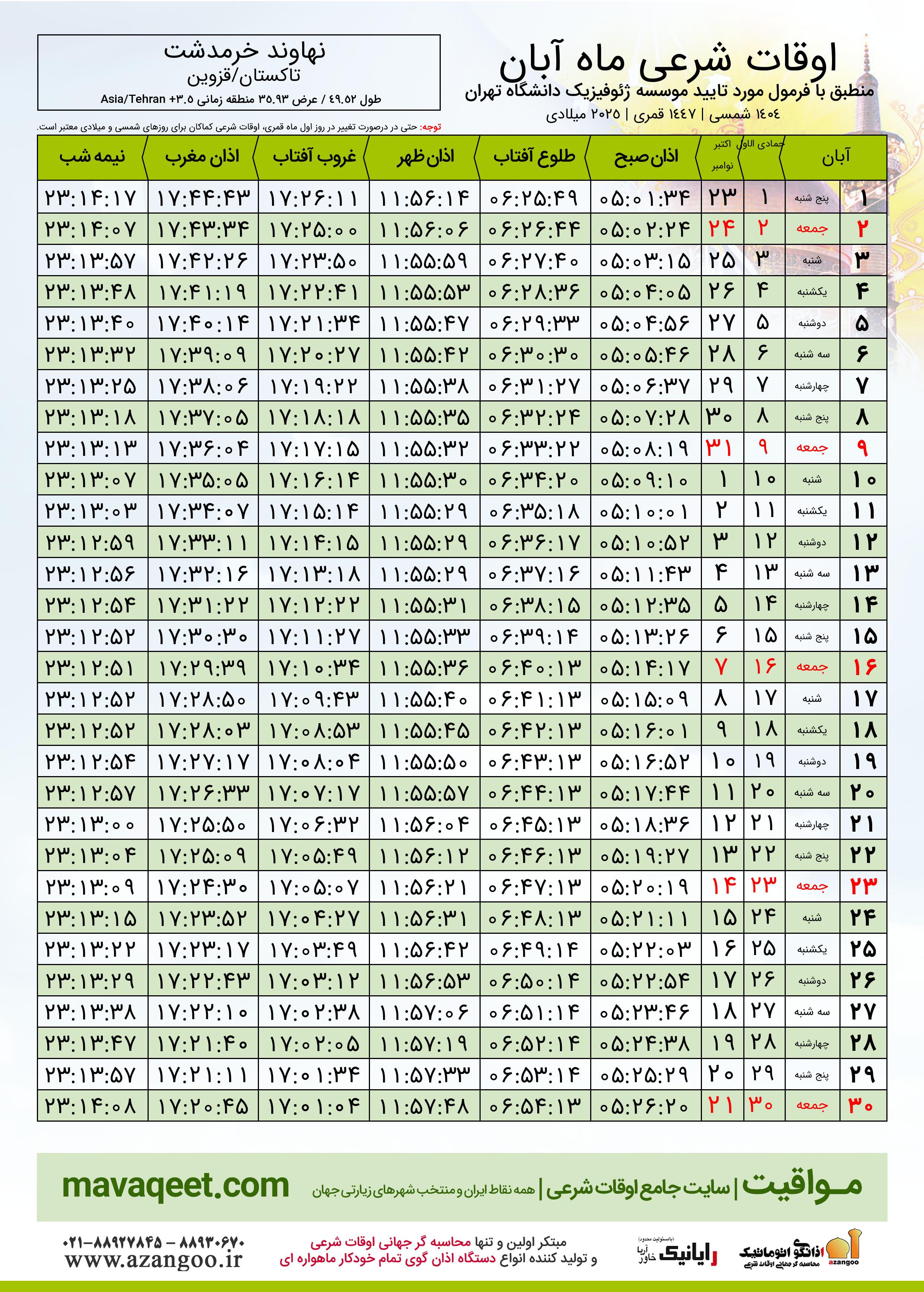 جدول اوقات شرعی آبان ١٤٠٤ شمسی شهر نهاوند خرمدشت