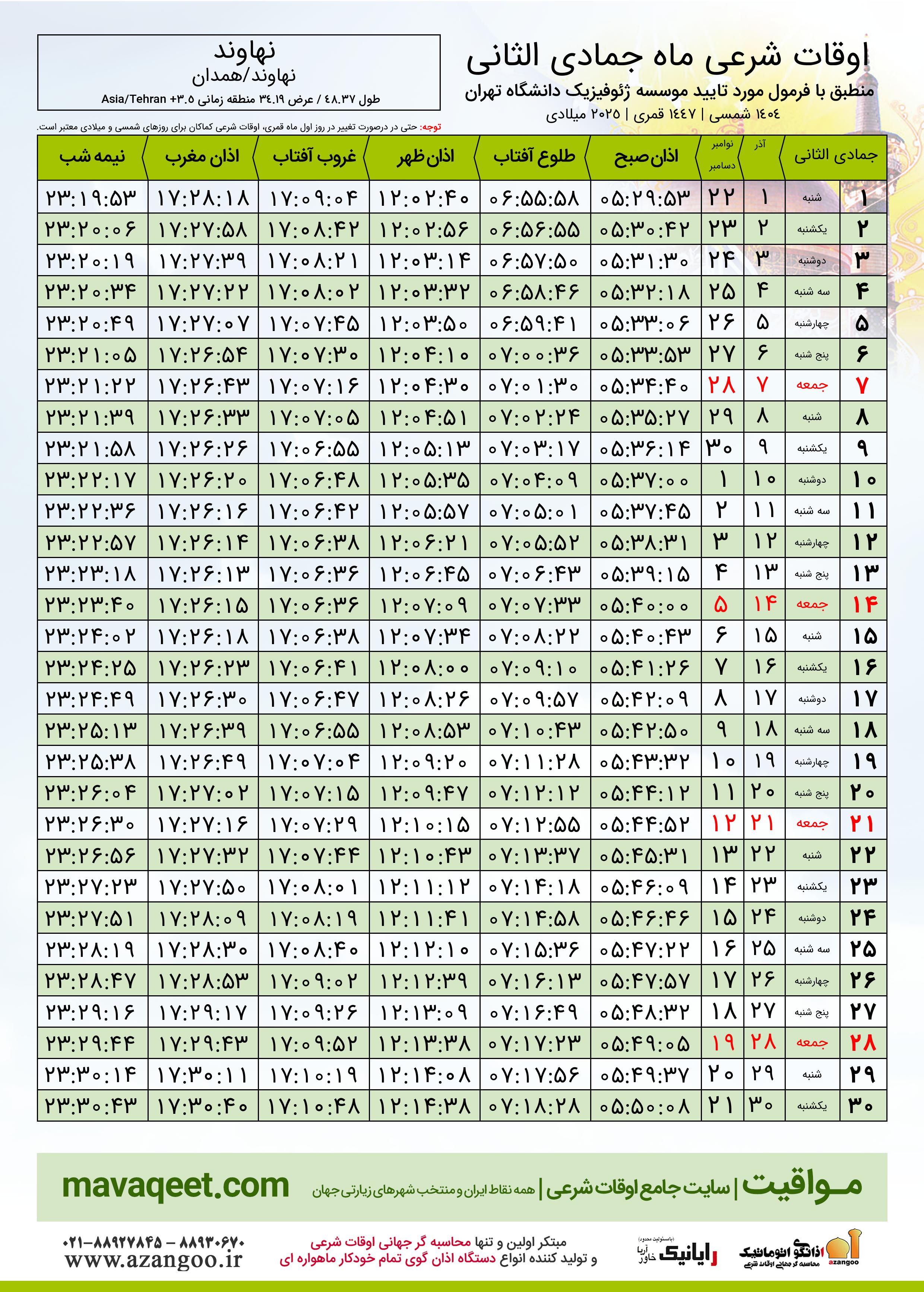 اوقات شرعی ماه جمادی الثانی ١٤٤٧ هـ.ق شهر نهاوند بر