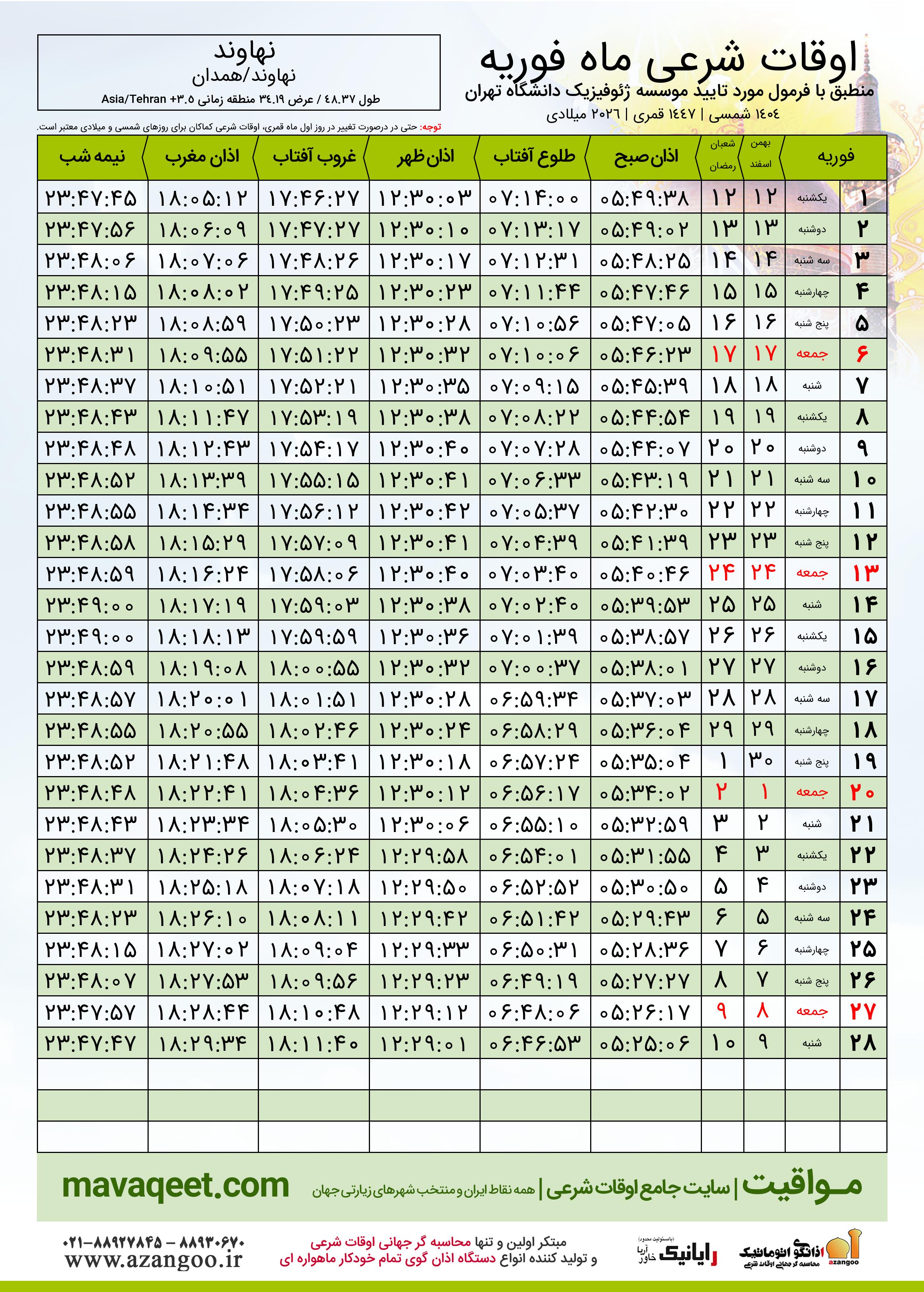 دانلود اوقات شرعی فوریه ٢٠٢٦ شهر نهاوند