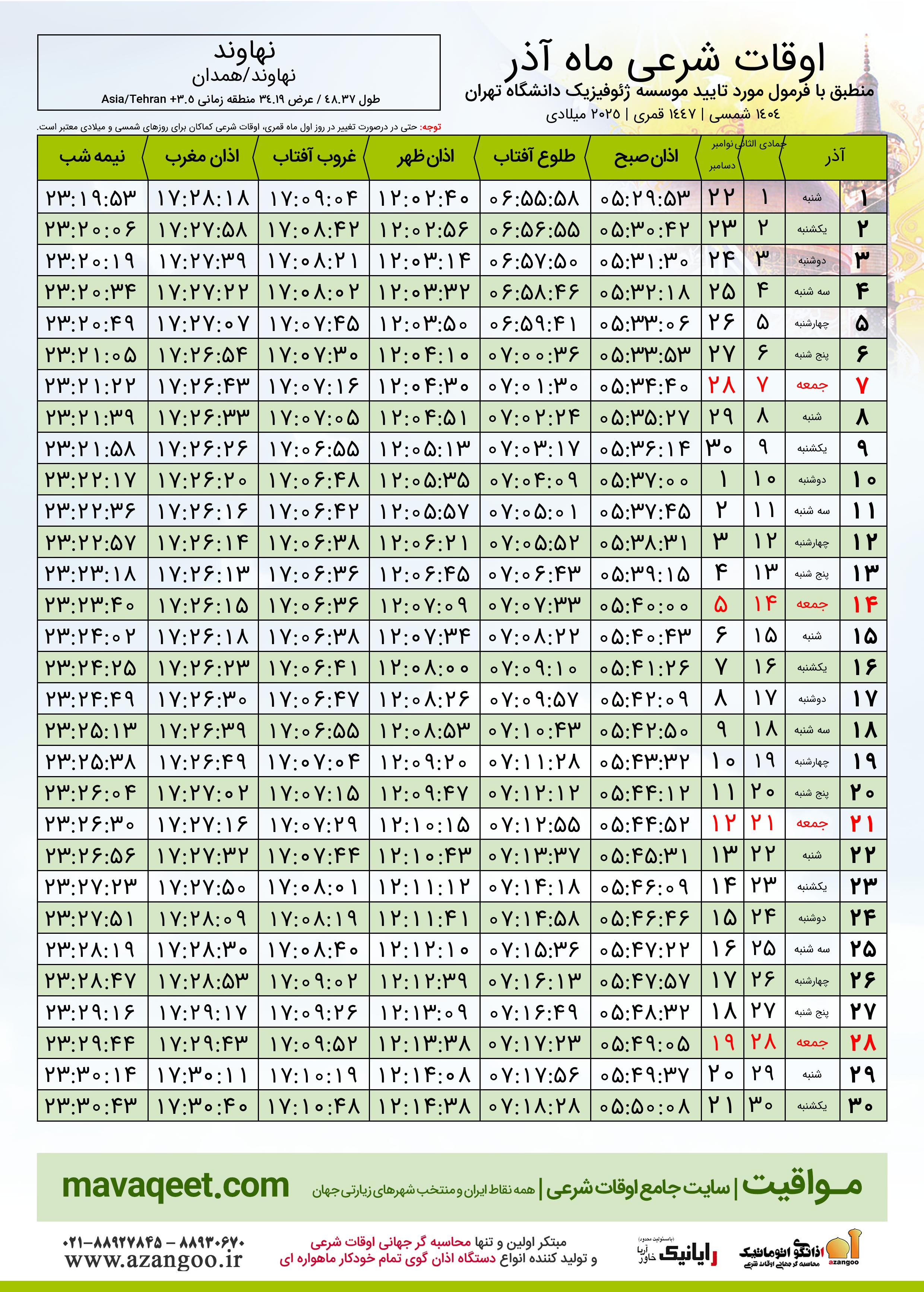 جدول اوقات شرعی آذر ١٤٠٤ شمسی شهر نهاوند