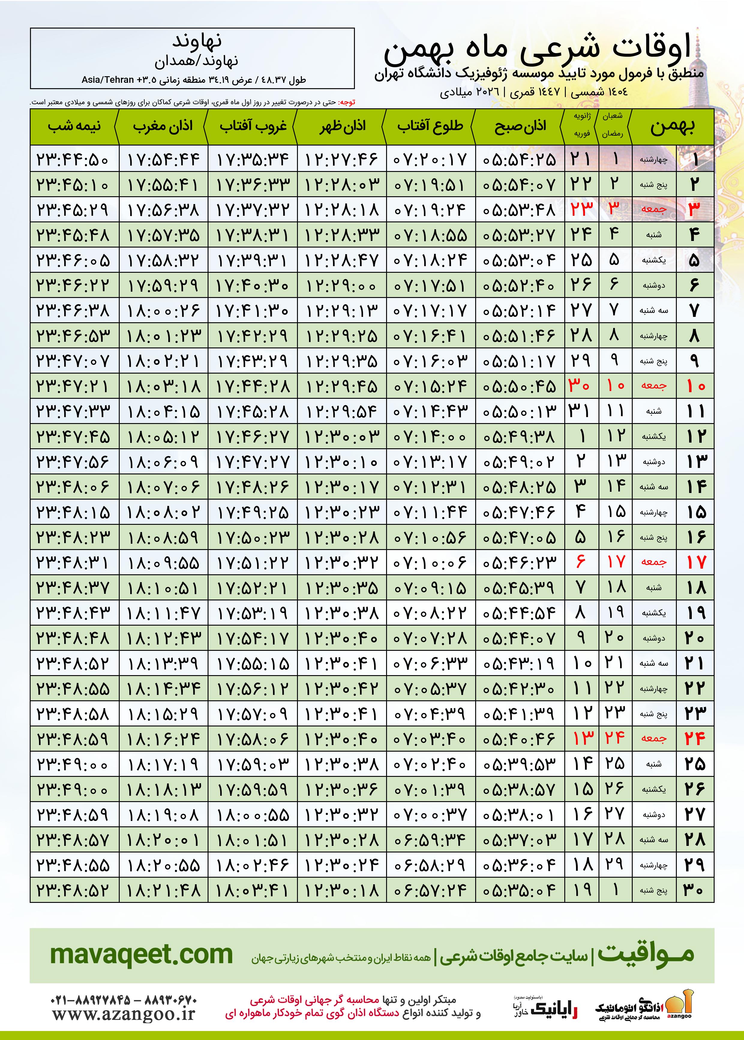دانلود اوقات شرعی بهمن ٠٤ - ١٤٠٤ شهر نهاوند