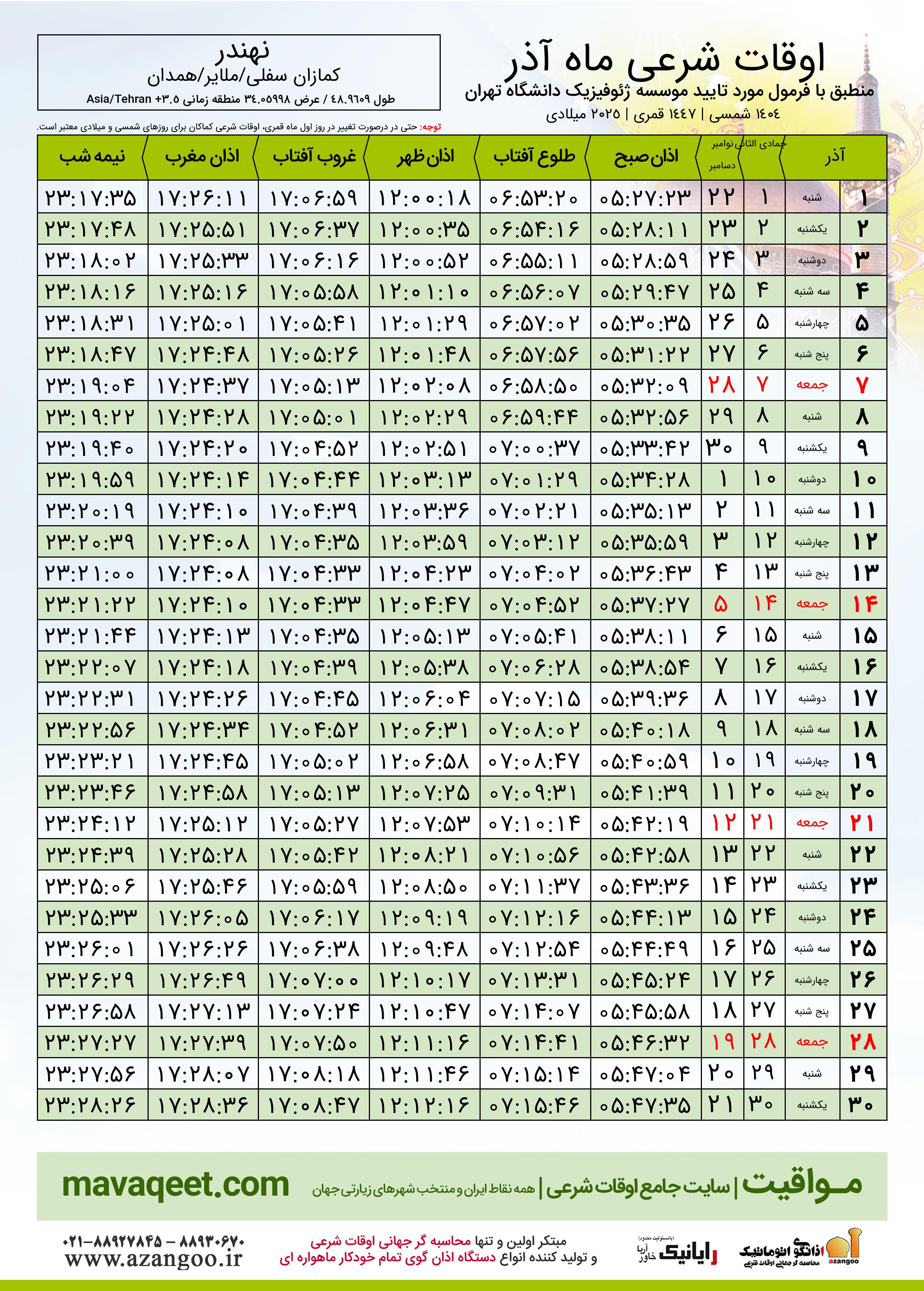 اوقات شرعی آذر ١٤٠٤ شمسی روستای نهندر
