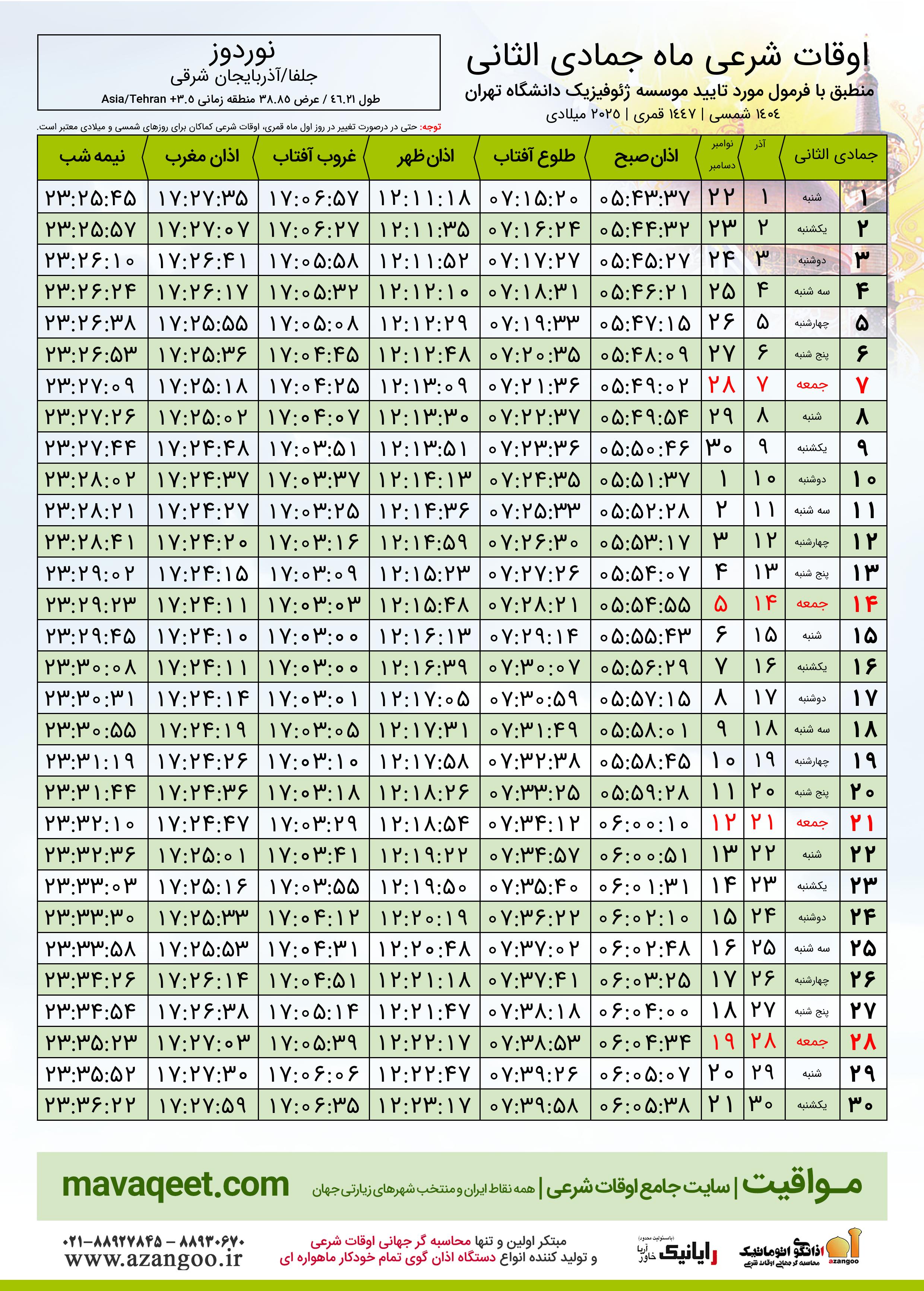 جدول اوقات شرعی جمادی الثانی ١٤٤٧ قمری شهر نوردوز