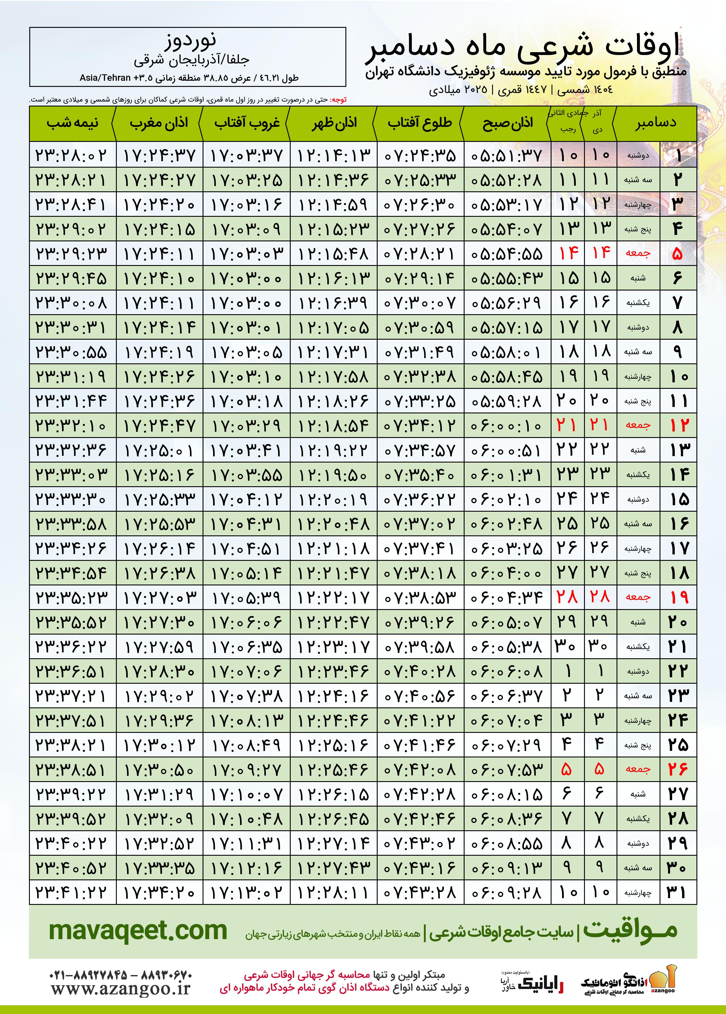 جدول اوقات شرعی آذر ١٤٠٤ شمسی شهر نوردوز