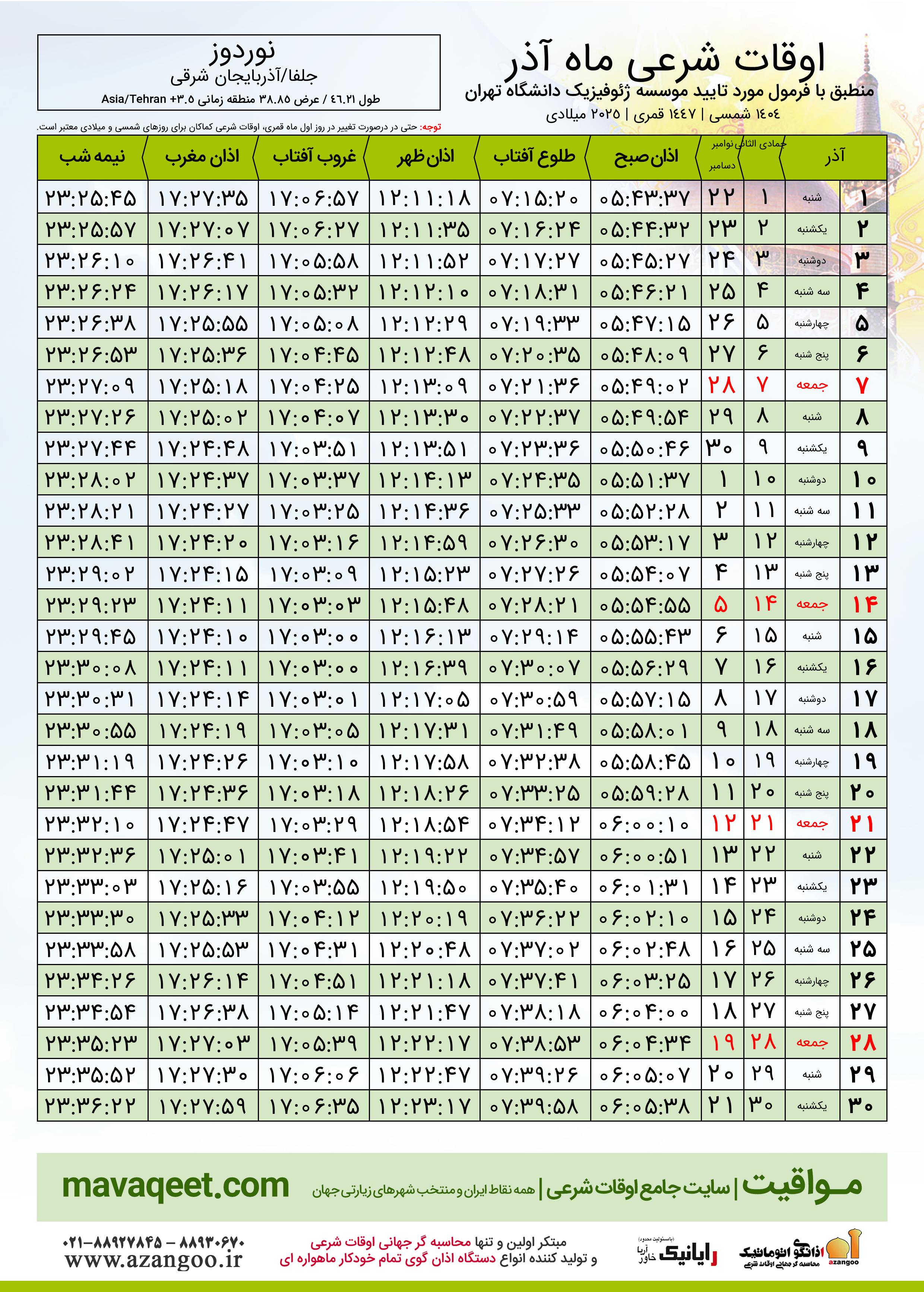 دانلود اوقات شرعی آذر ٠٤ - ١٤٠٤ شهر نوردوز