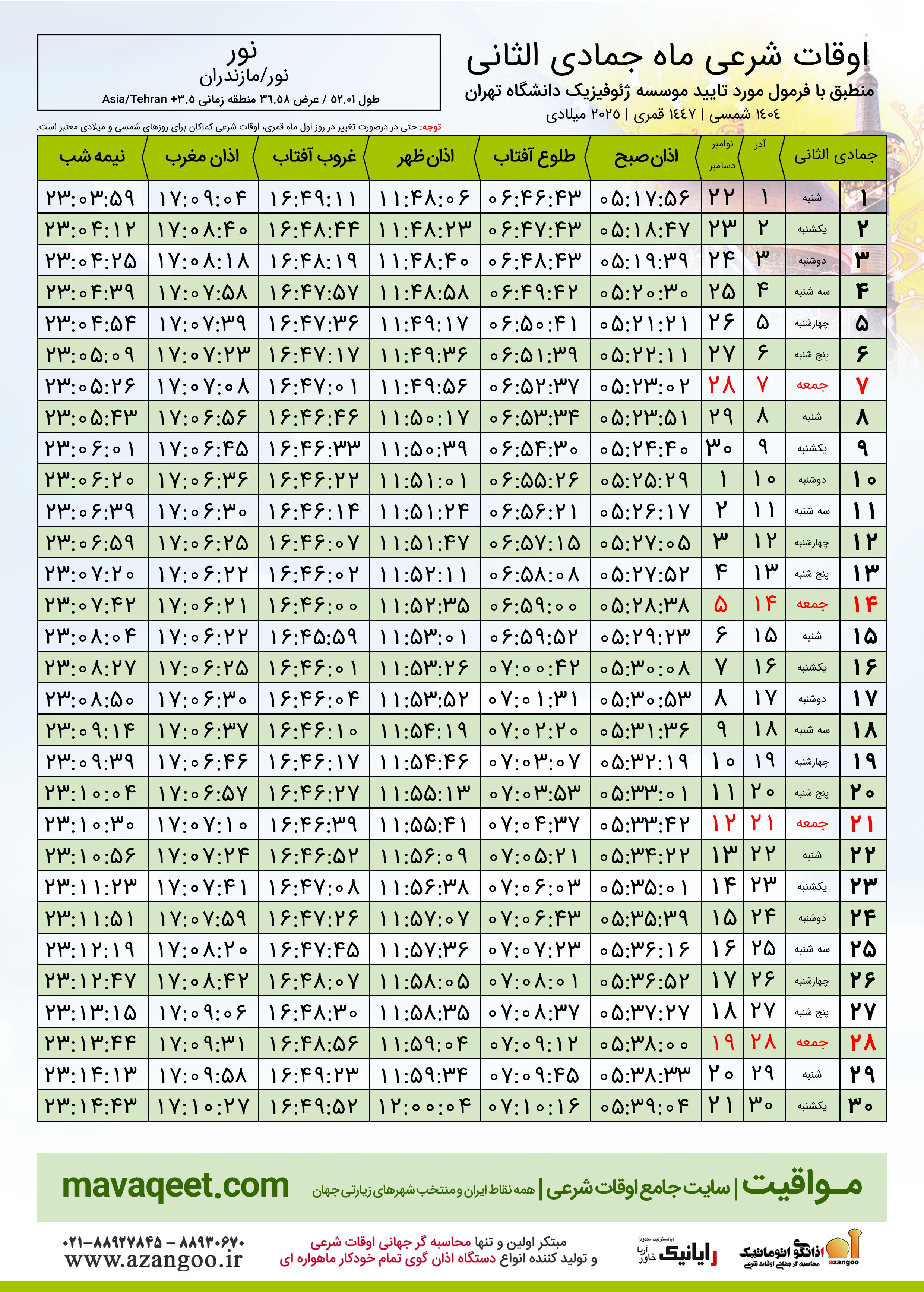 اوقات شرعی ماه جمادی الثانی ١٤٤٧ هـ.ق شهر نور بر