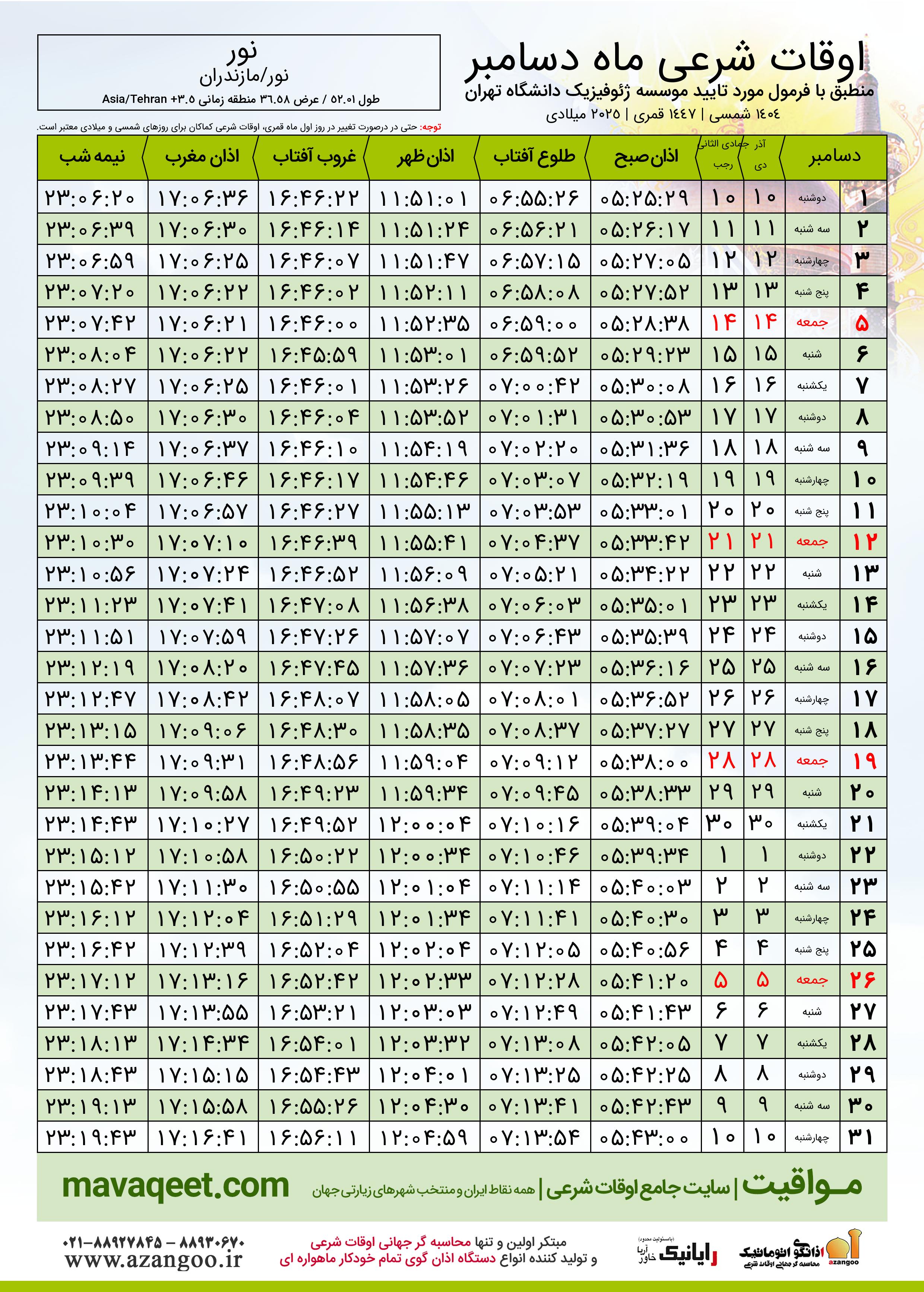 جدول اوقات شرعی آذر ١٤٠٤ شمسی شهر نور