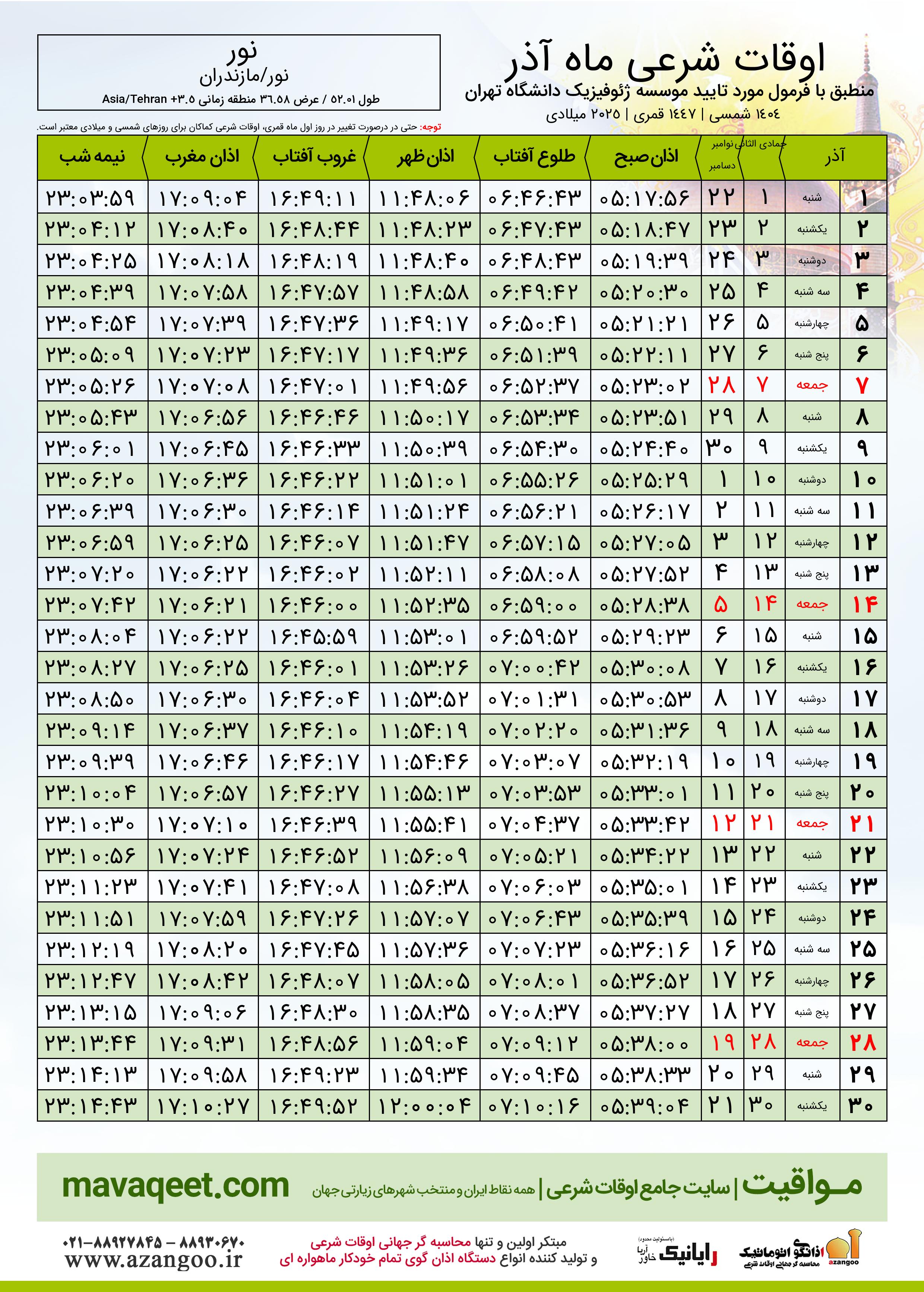 اوقات شرعی آذر ١٤٠٤ شمسی شهر نور