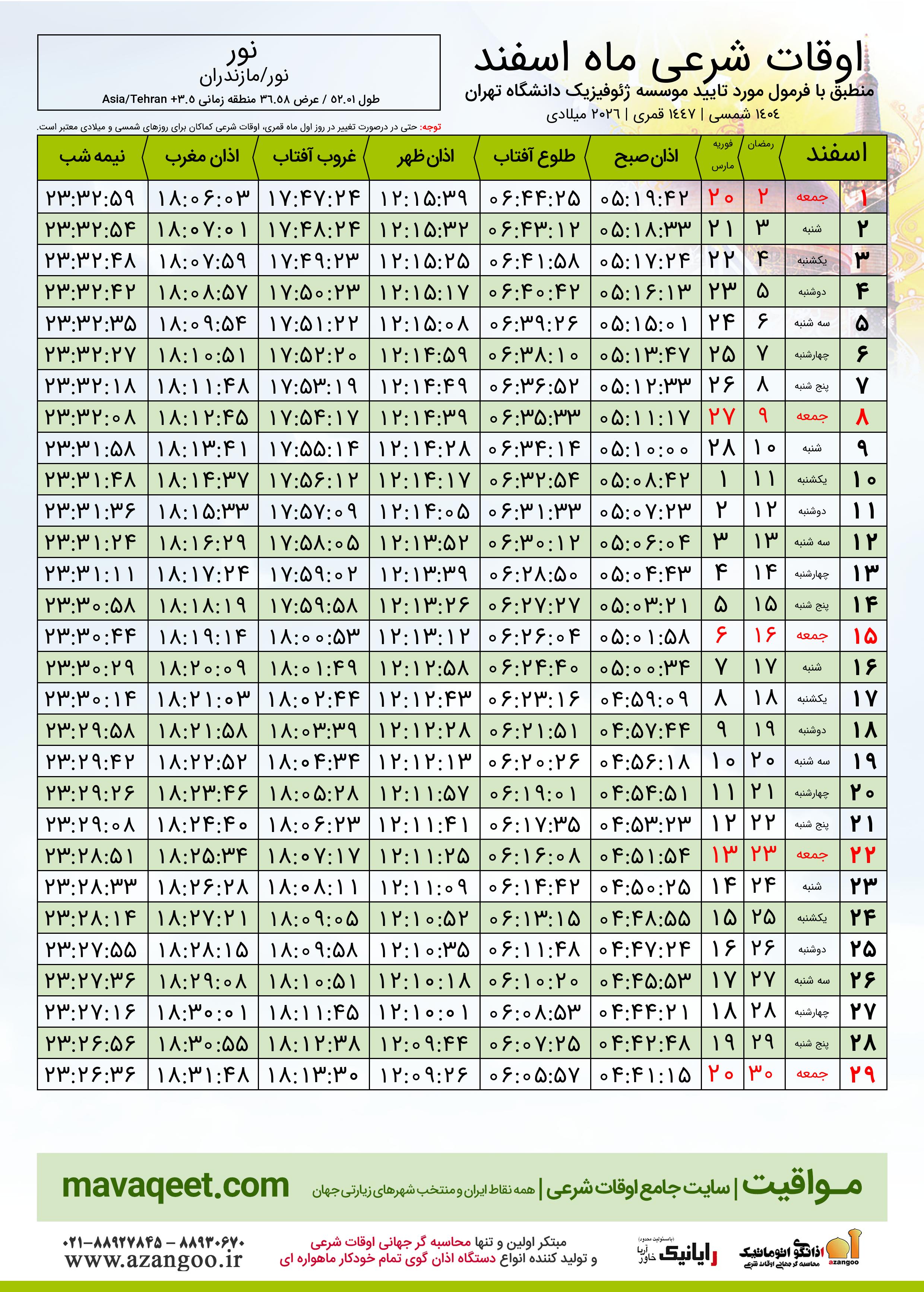 اوقات شرعی ماه رمضان شهر نور ١٤٠٤ - ٠٤ شمسی | ٢٠٢٦ میلادی