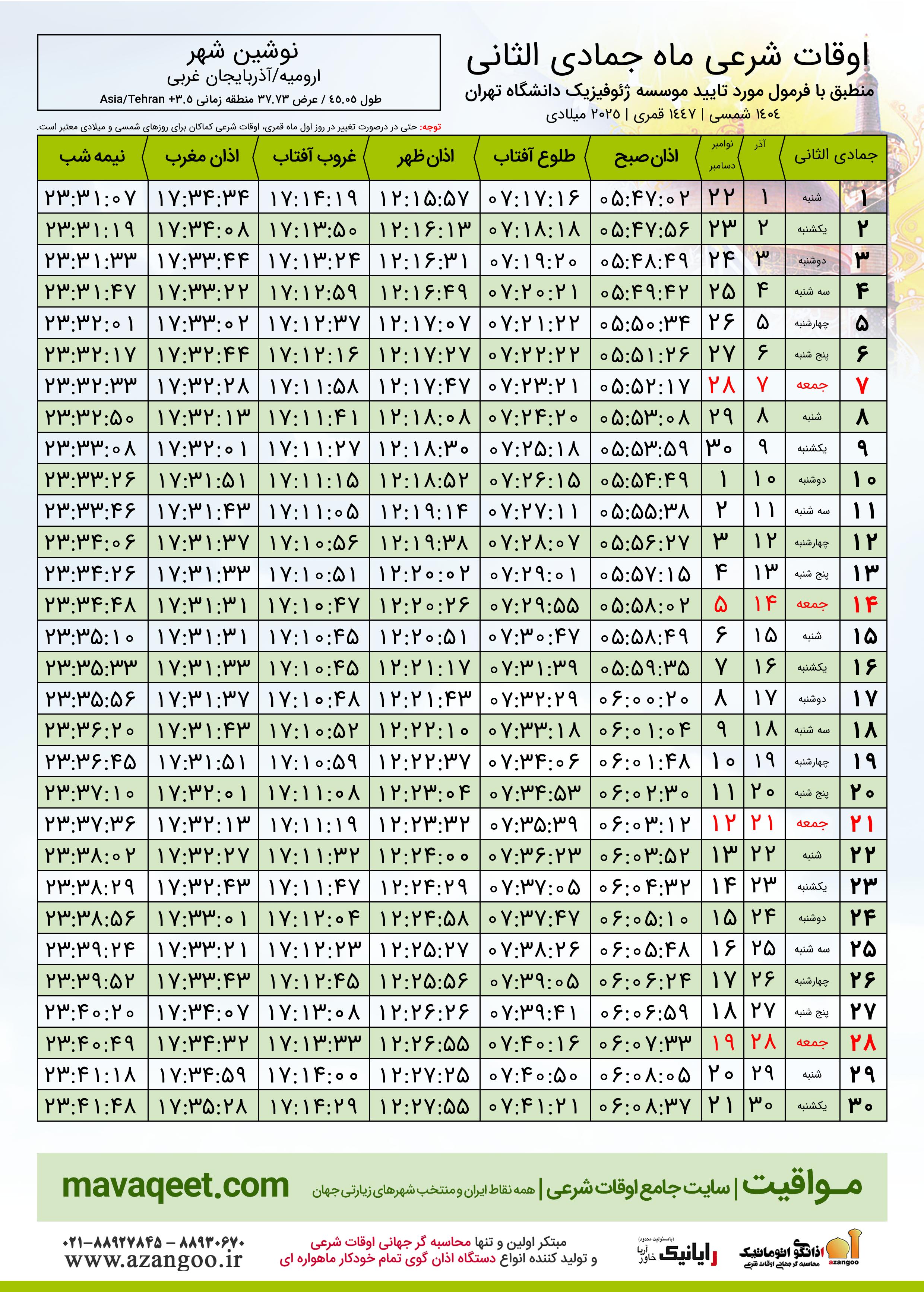 جدول اوقات شرعی جمادی الثانی ١٤٤٧ قمری شهر نوشین شهر