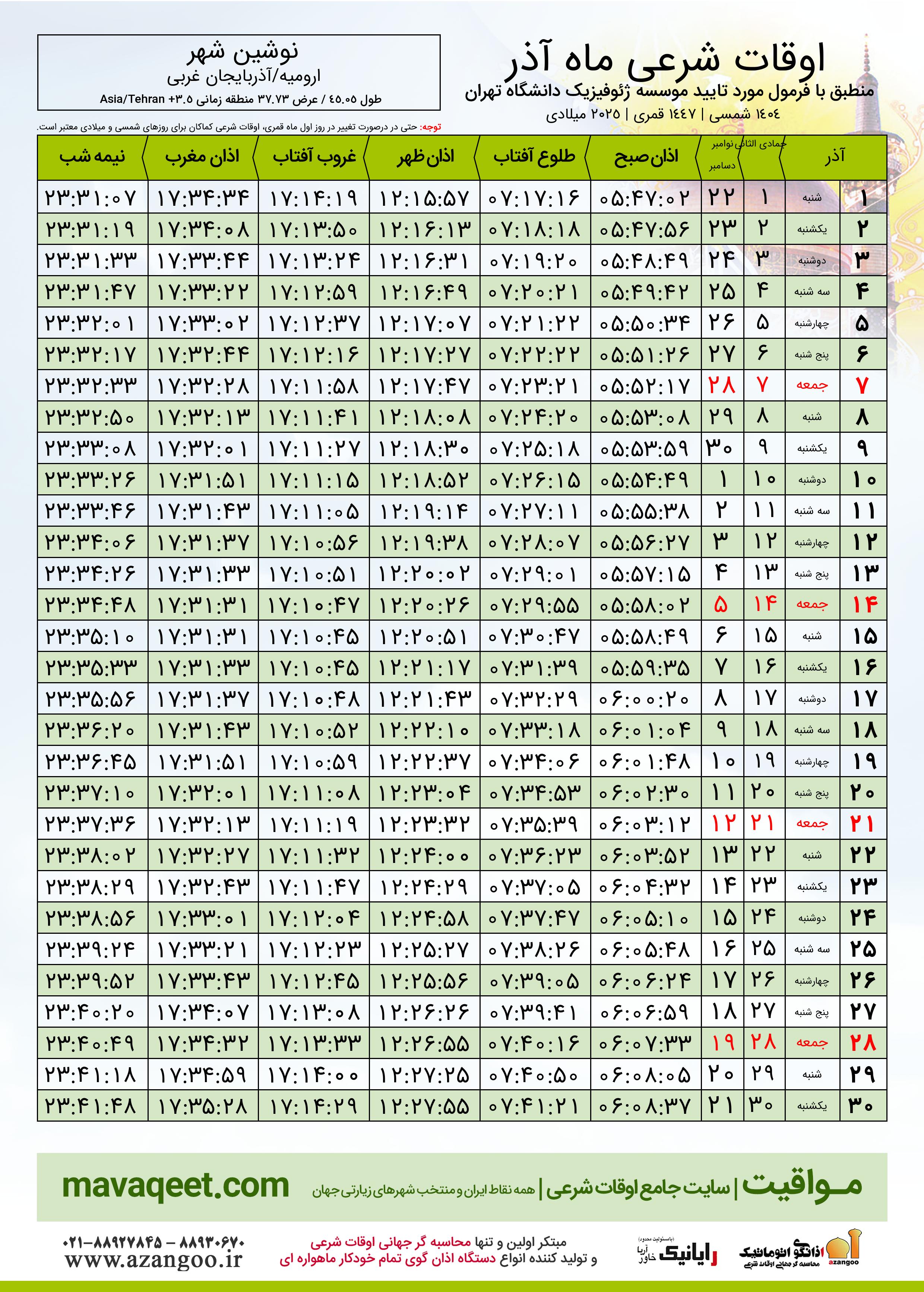 جدول اوقات شرعی آذر ١٤٠٤ شمسی شهر نوشین شهر