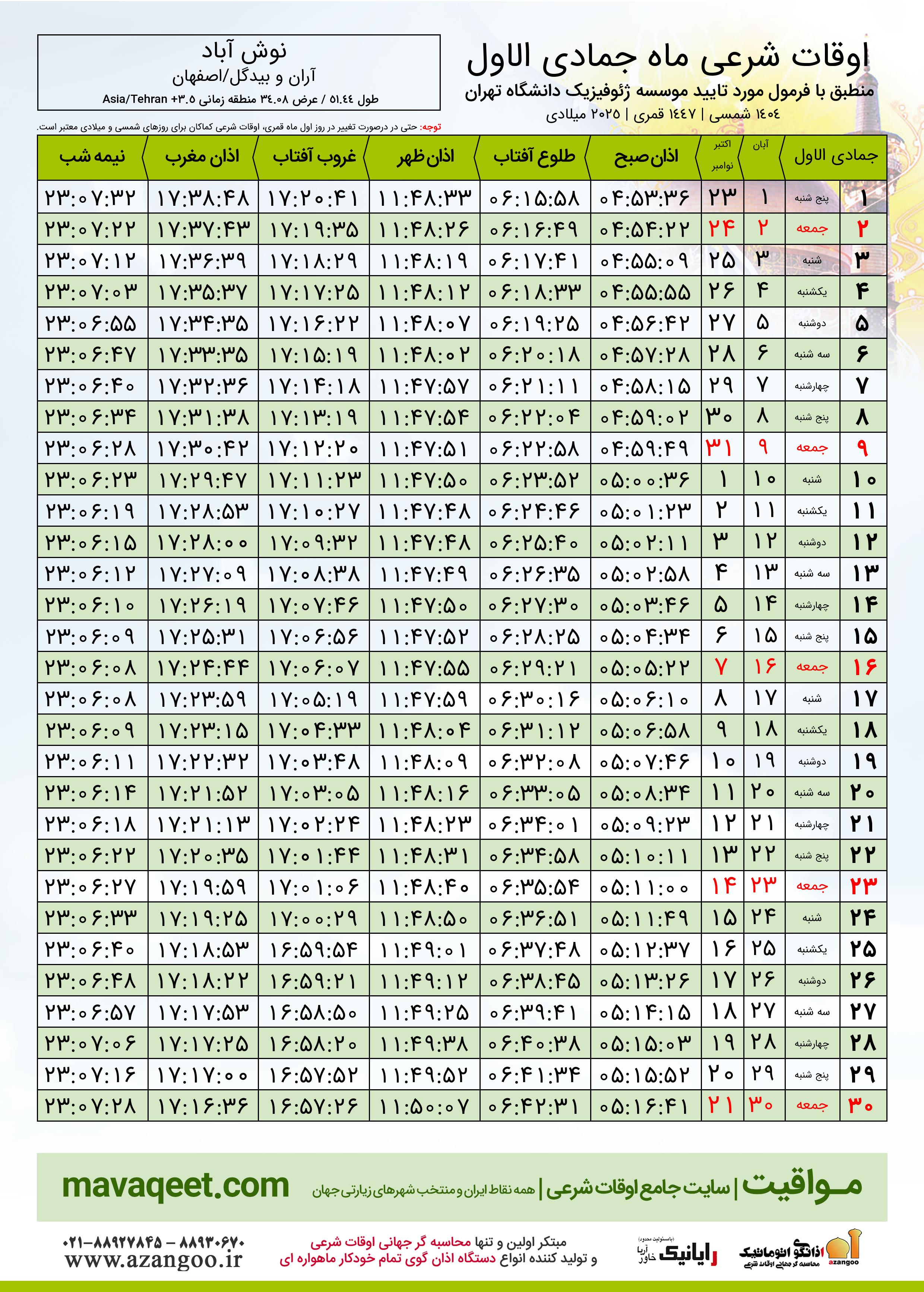 جدول اوقات شرعی جمادی الاول ١٤٤٧ قمری شهر نوش آباد