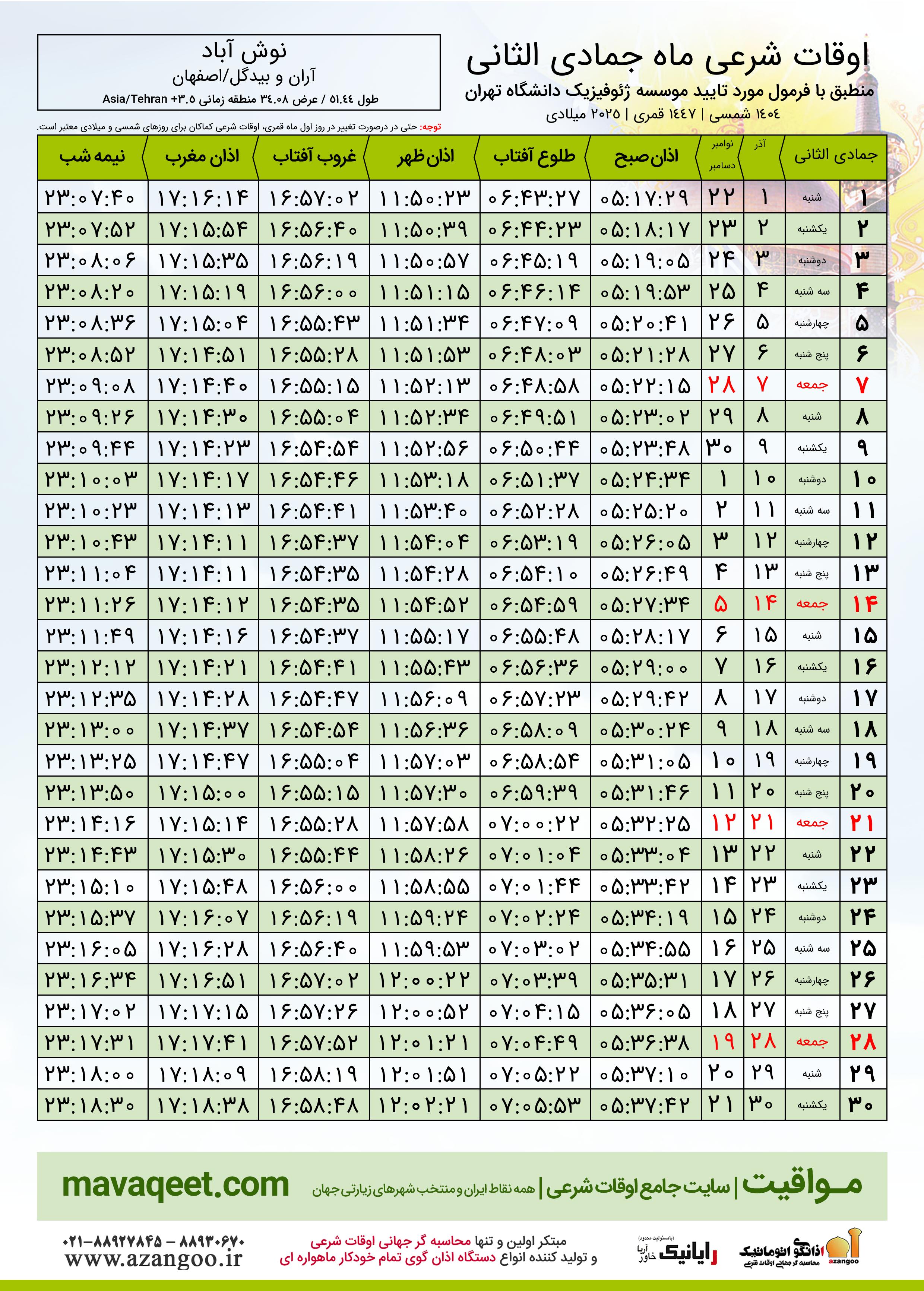جدول اوقات شرعی جمادی الثانی ١٤٤٧ قمری شهر نوش آباد