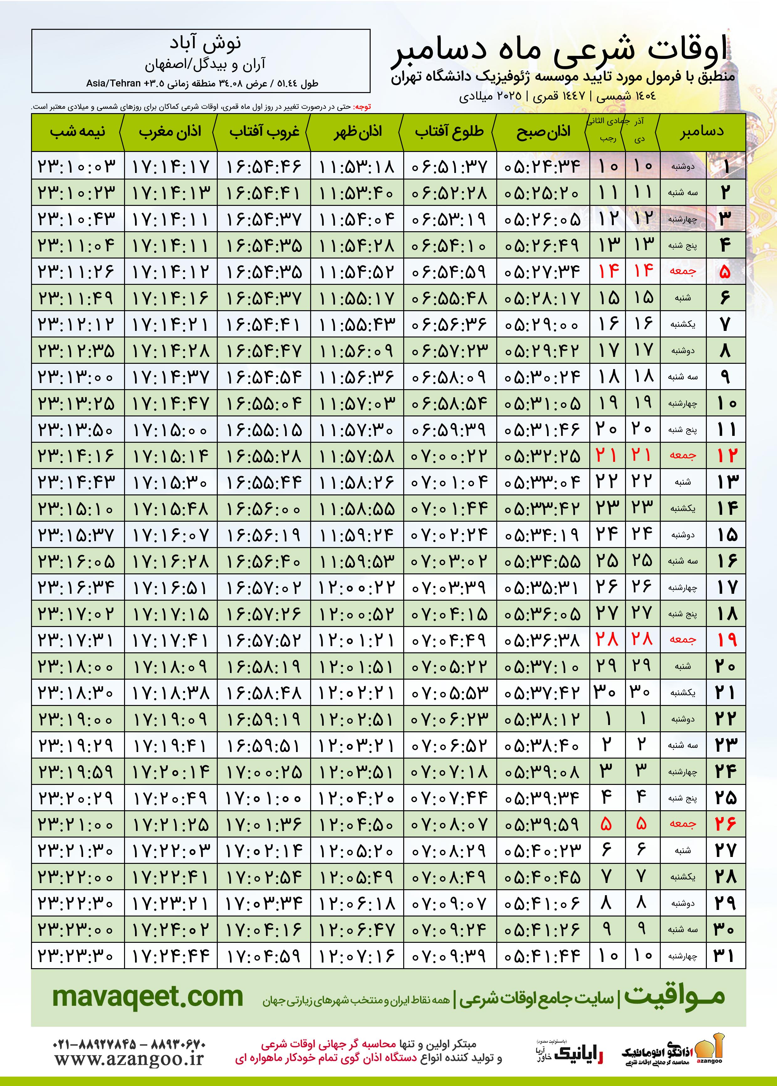 جدول اوقات شرعی دسامبر ٢٠٢٥ میلادی شهر نوش آباد