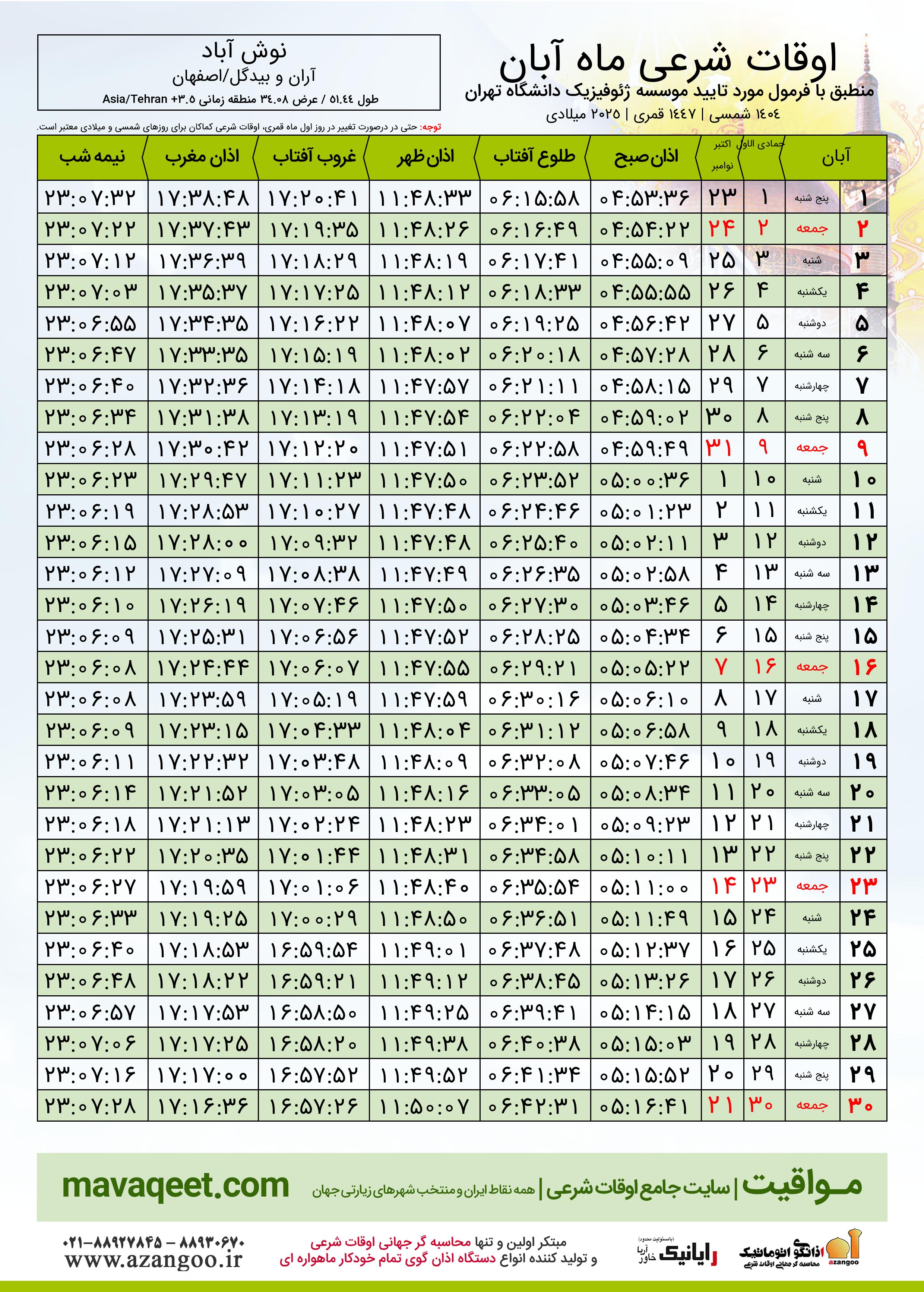 جدول اوقات شرعی آبان ١٤٠٤ شمسی شهر نوش آباد