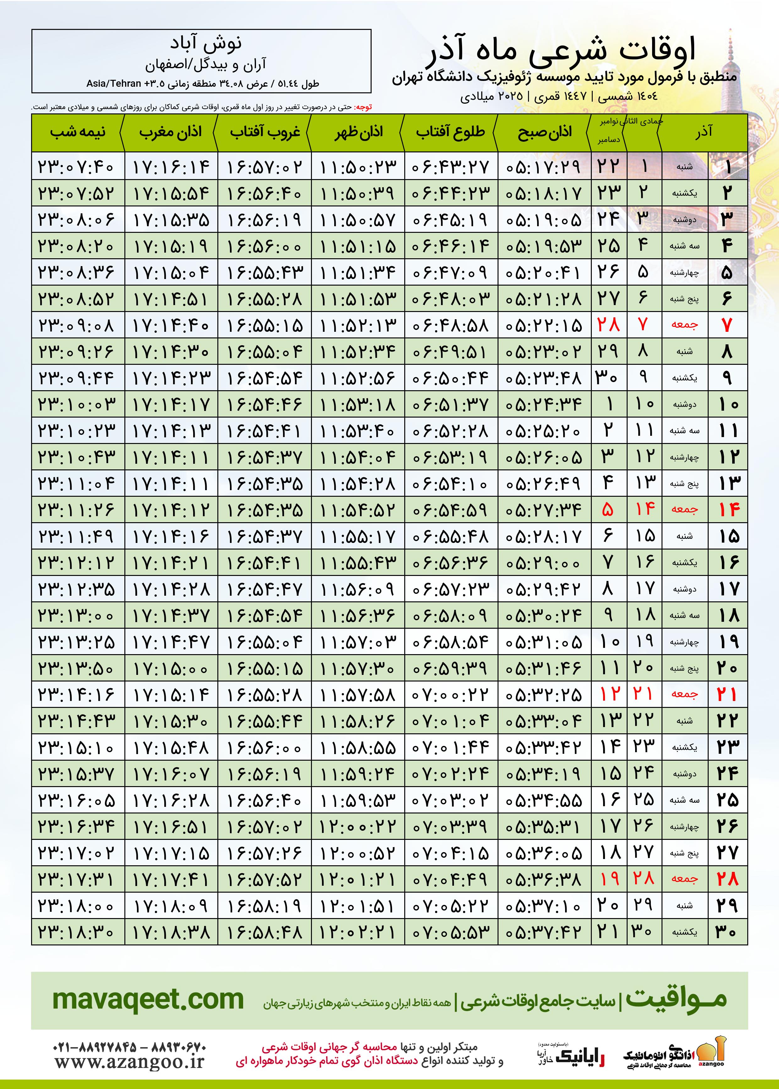 اوقات شرعی آذر ١٤٠٤ شمسی شهر نوش آباد