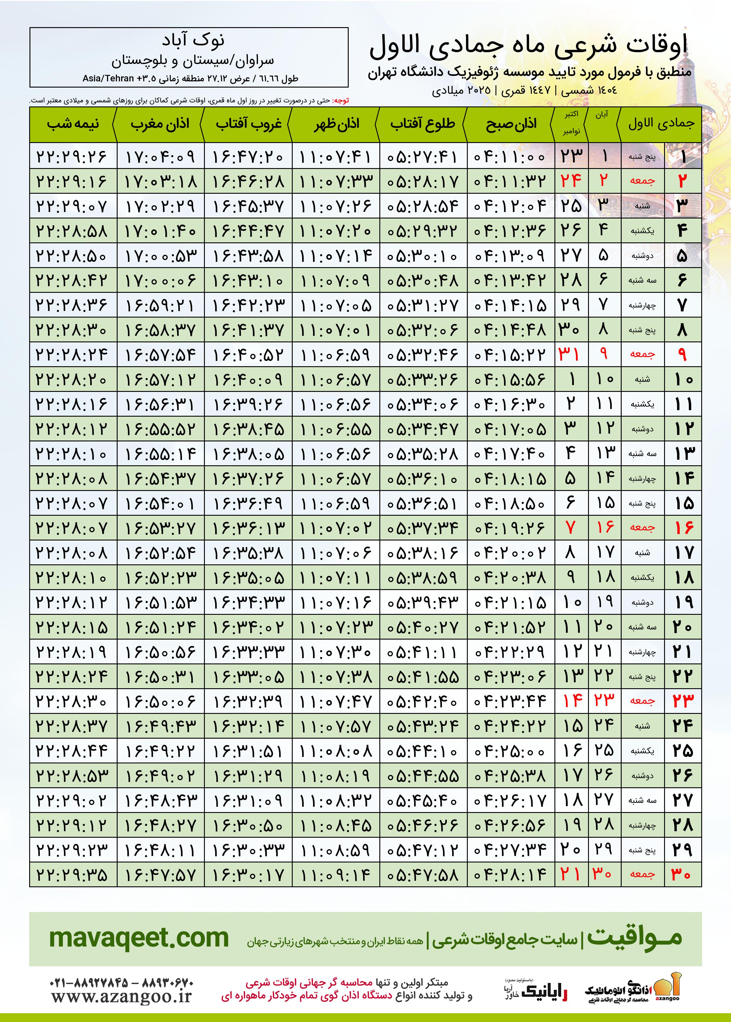 جدول اوقات شرعی جمادی الاول ١٤٤٧ قمری شهر نوک آباد