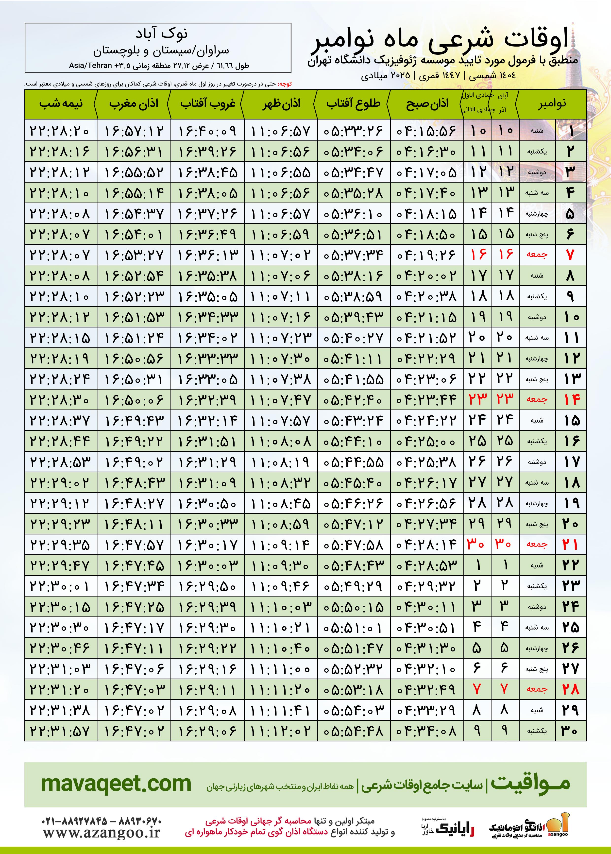 جدول اوقات شرعی نوامبر ٢٠٢٥ میلادی شهر نوک آباد