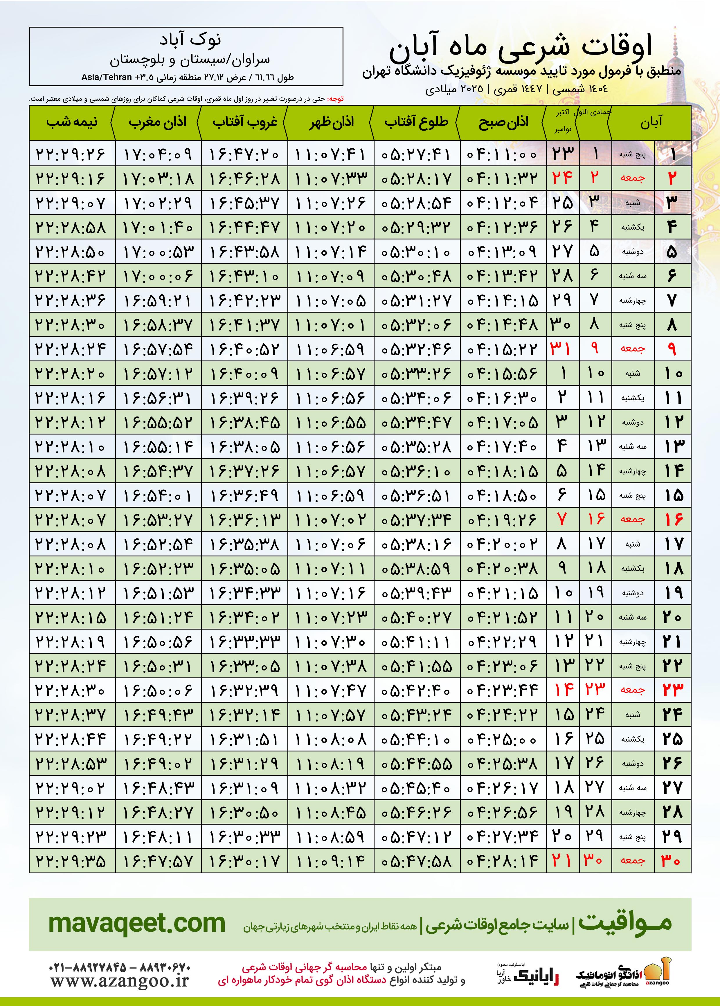 جدول اوقات شرعی آبان ١٤٠٤ شمسی شهر نوک آباد