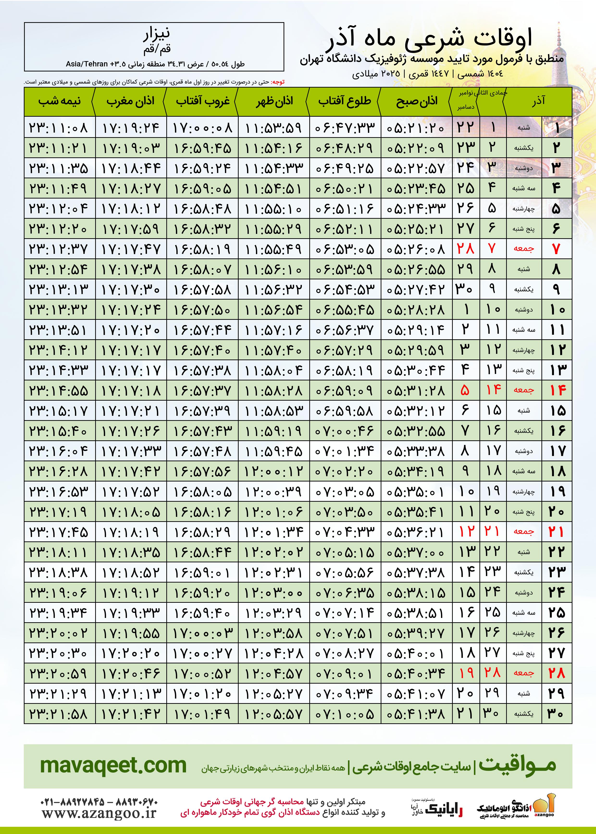 جدول اوقات شرعی آذر ١٤٠٤ شمسی شهر نیزار