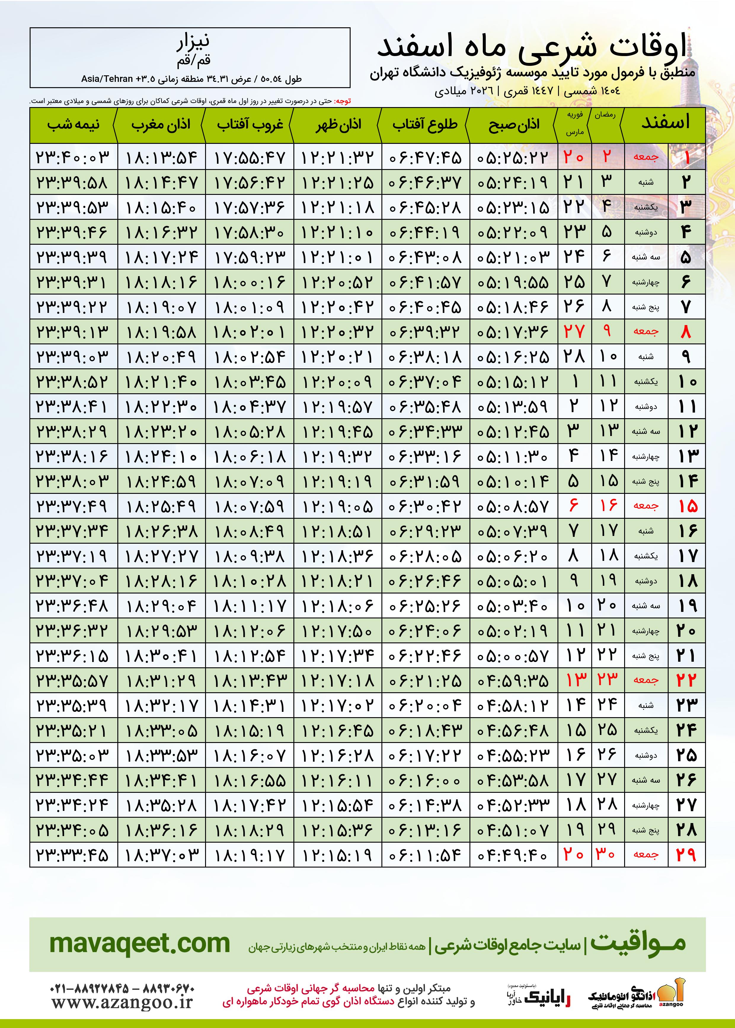 جدول اوقات شرعی اسفند ١٤٠٤ شمسی شهر نیزار