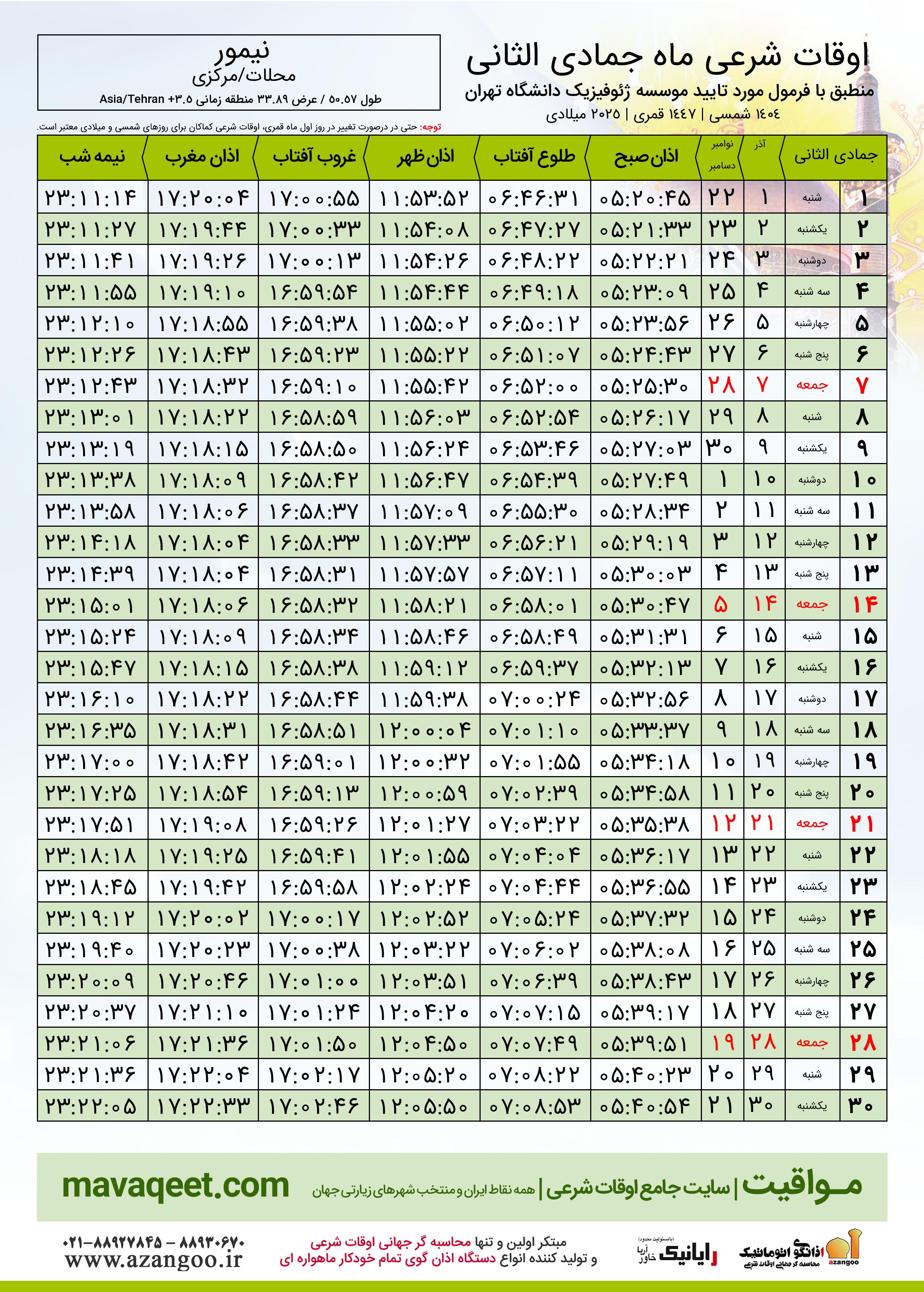 جدول اوقات شرعی جمادی الثانی ١٤٤٧ قمری شهر نیمور