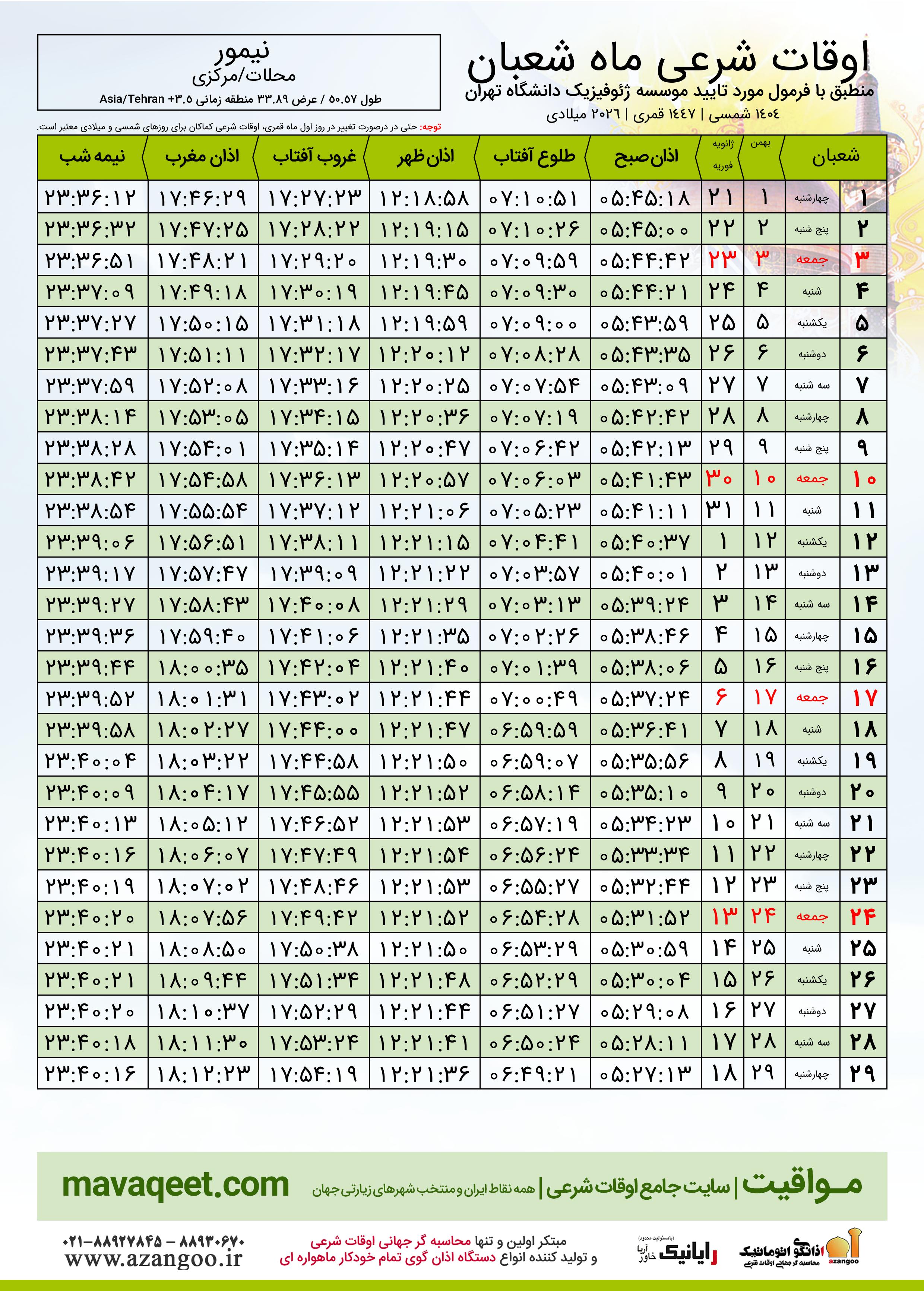اوقات شرعی ماه شعبان ١٤٤٧ هـ.ق شهر نیمور بر