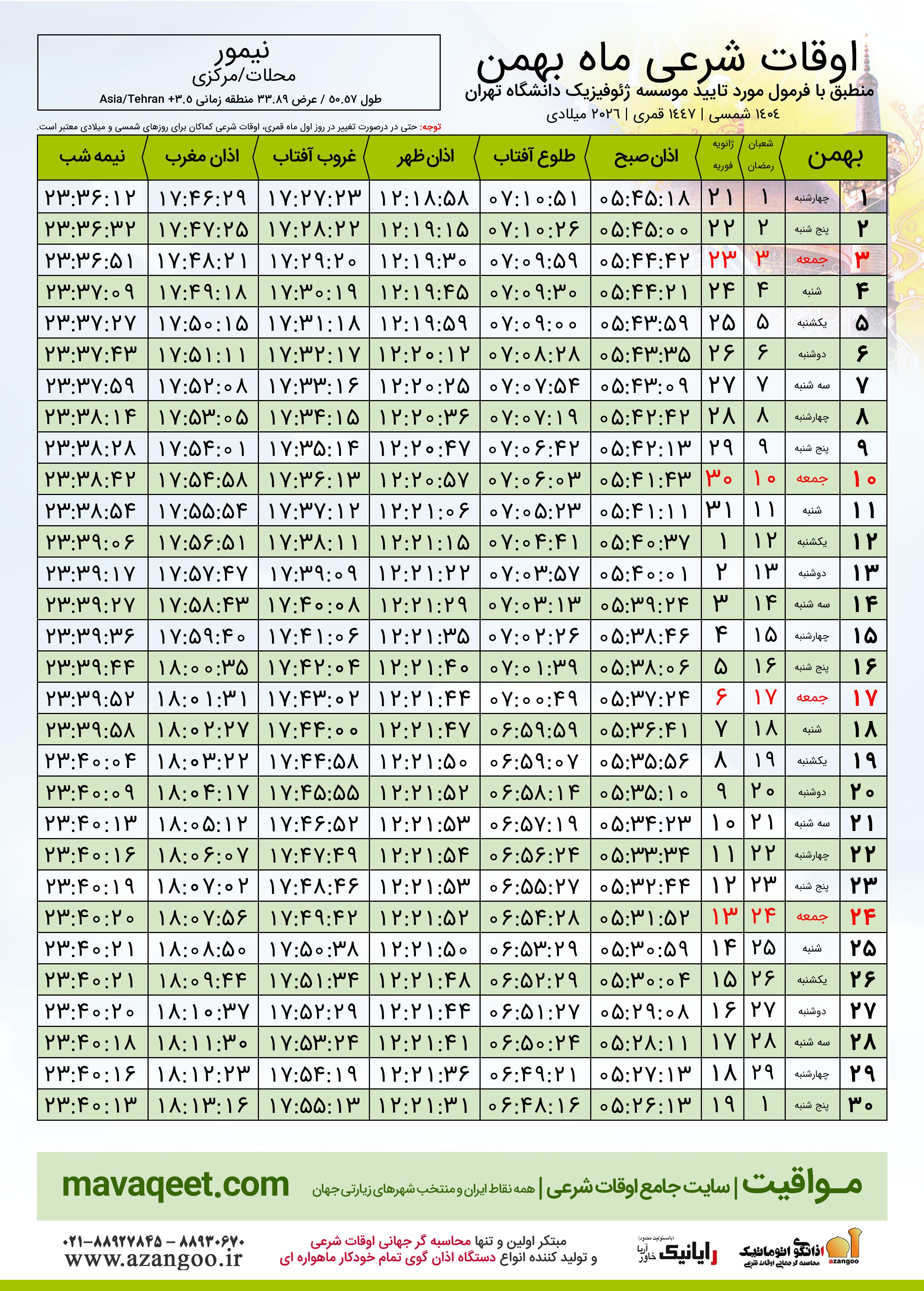 دانلود اوقات شرعی بهمن ٠٤ - ١٤٠٤ شهر نیمور