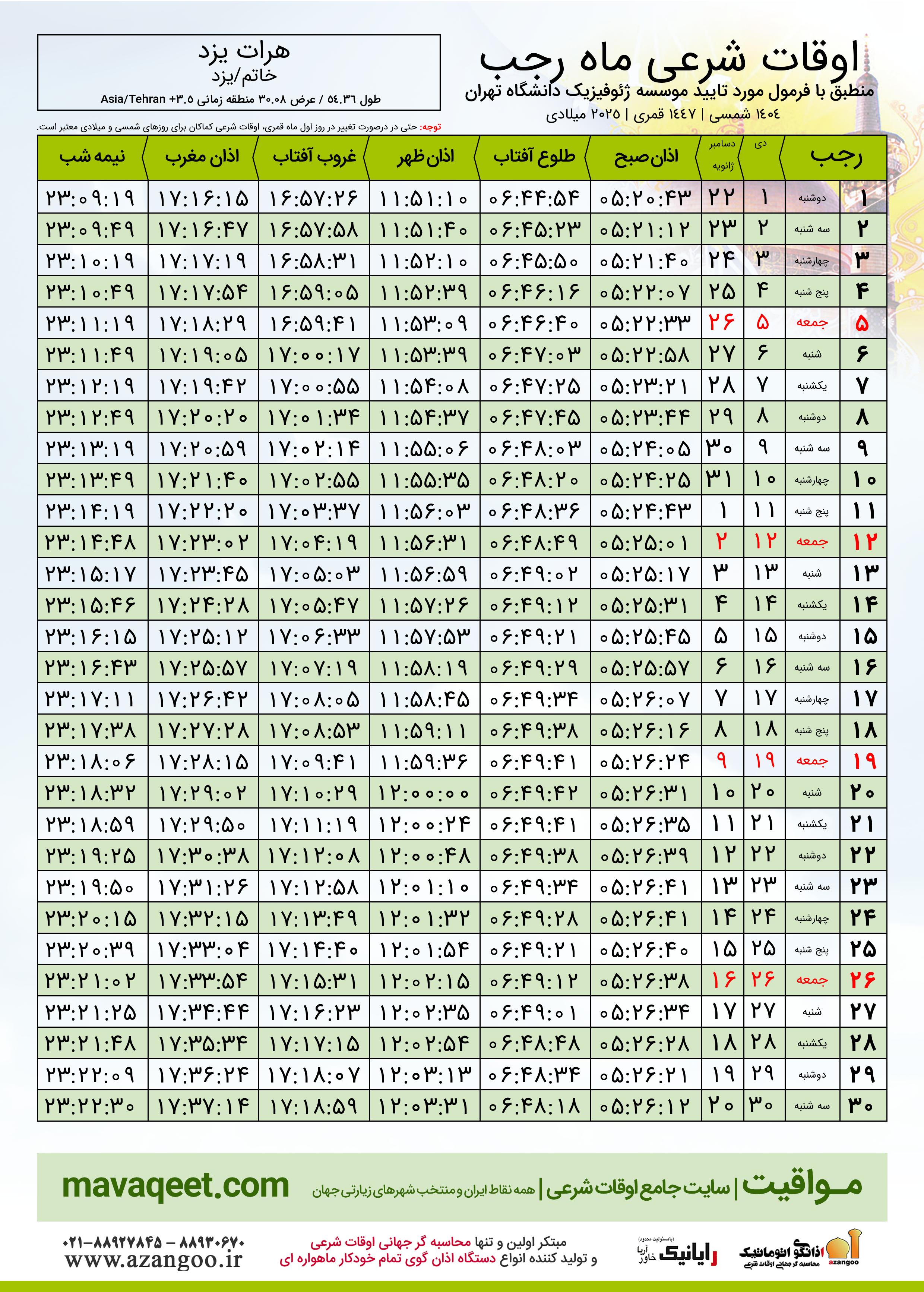 اوقات شرعی ماه رجب ١٤٤٧ هـ.ق شهر هرات یزد بر