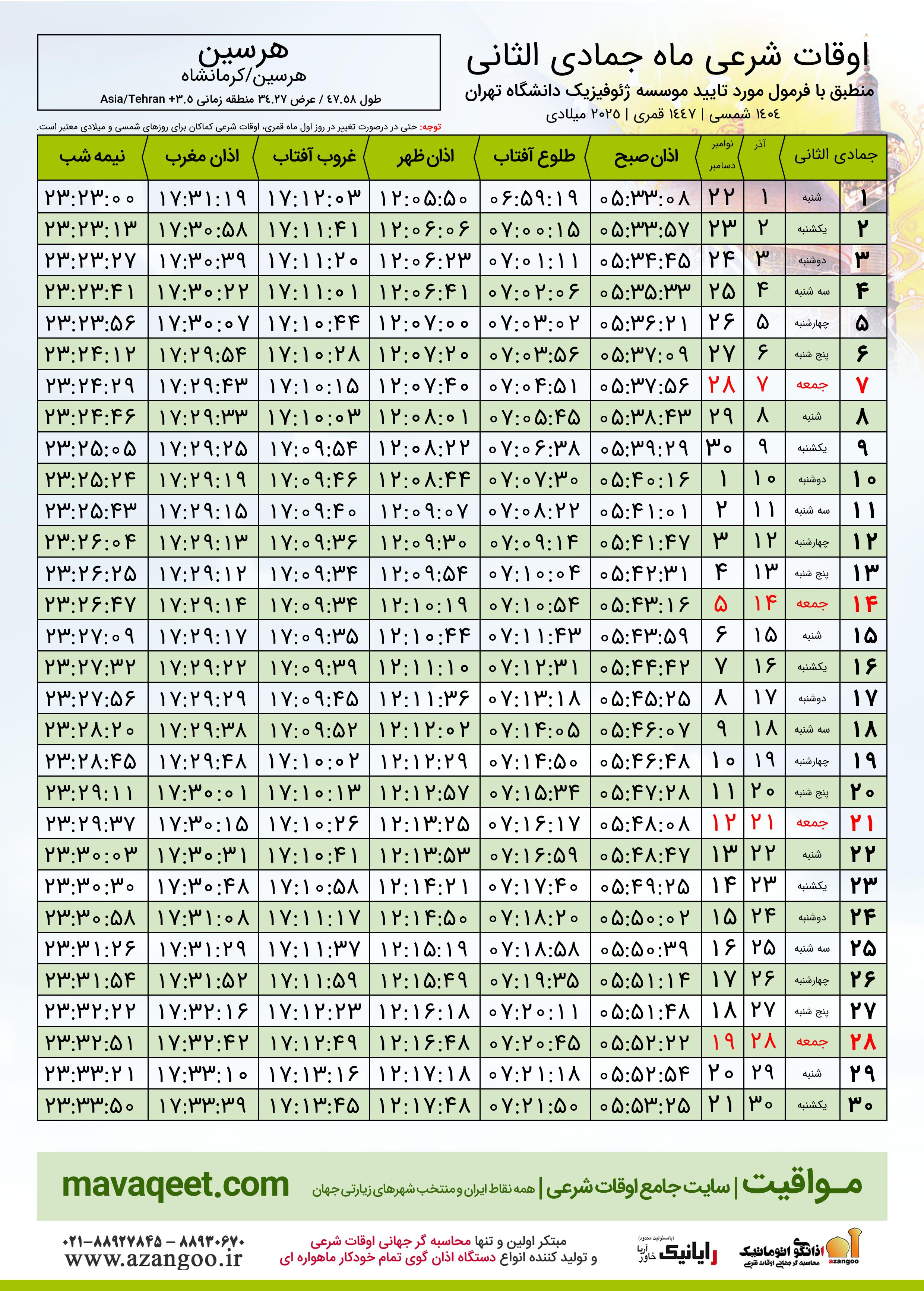جدول اوقات شرعی جمادی الثانی ١٤٤٧ قمری شهر هرسین