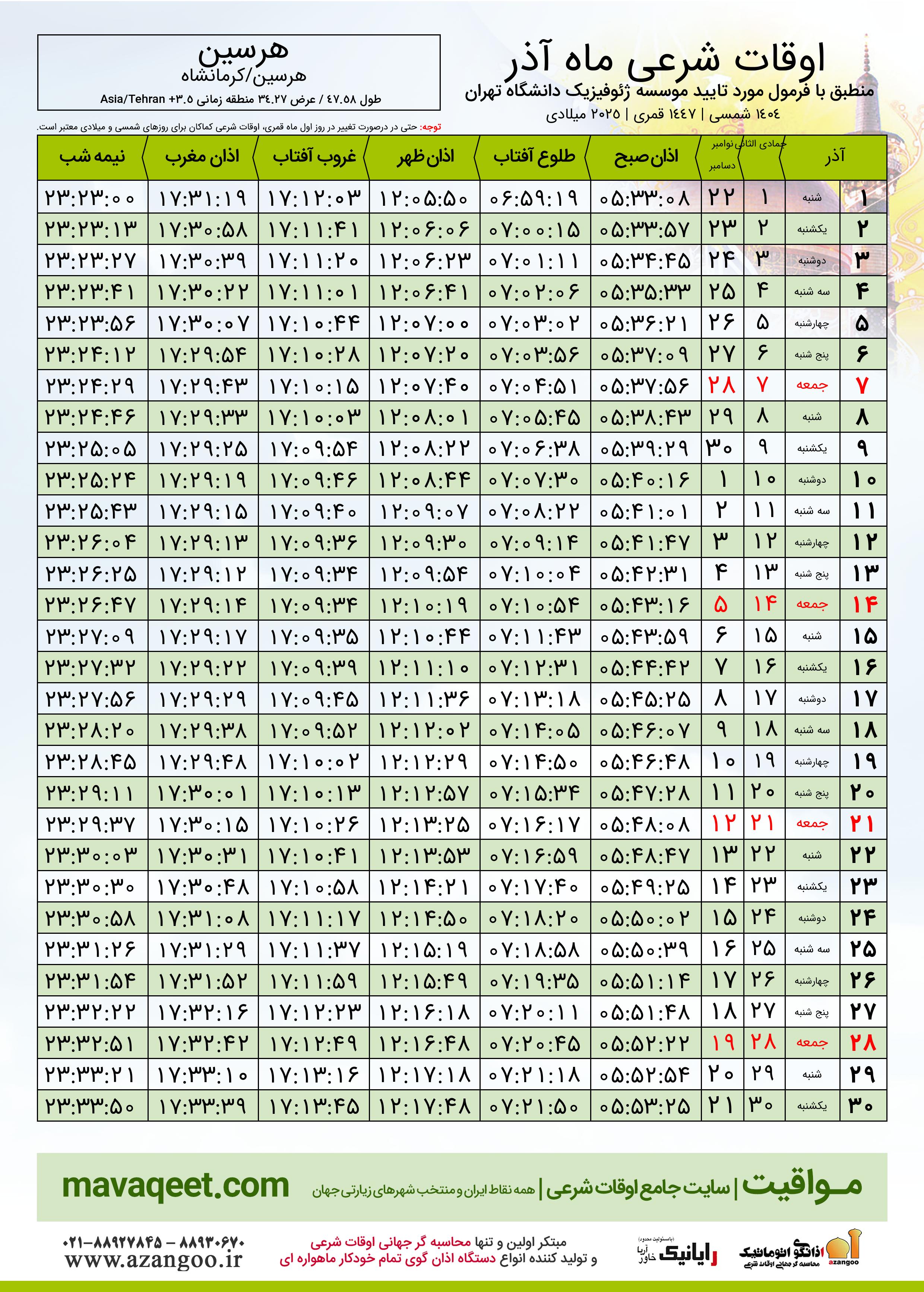 دانلود اوقات شرعی آذر ٠٤ - ١٤٠٤ شهر هرسین