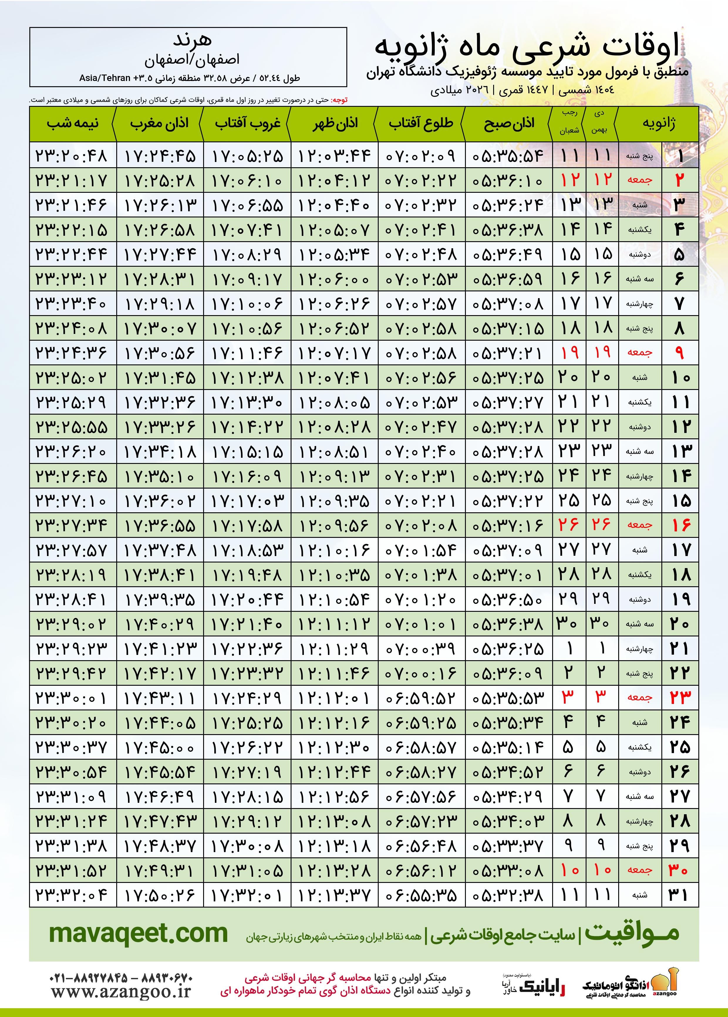 اوقات شرعی ماه رجب ١٤٤٧ هـ.ق شهر هرند بر