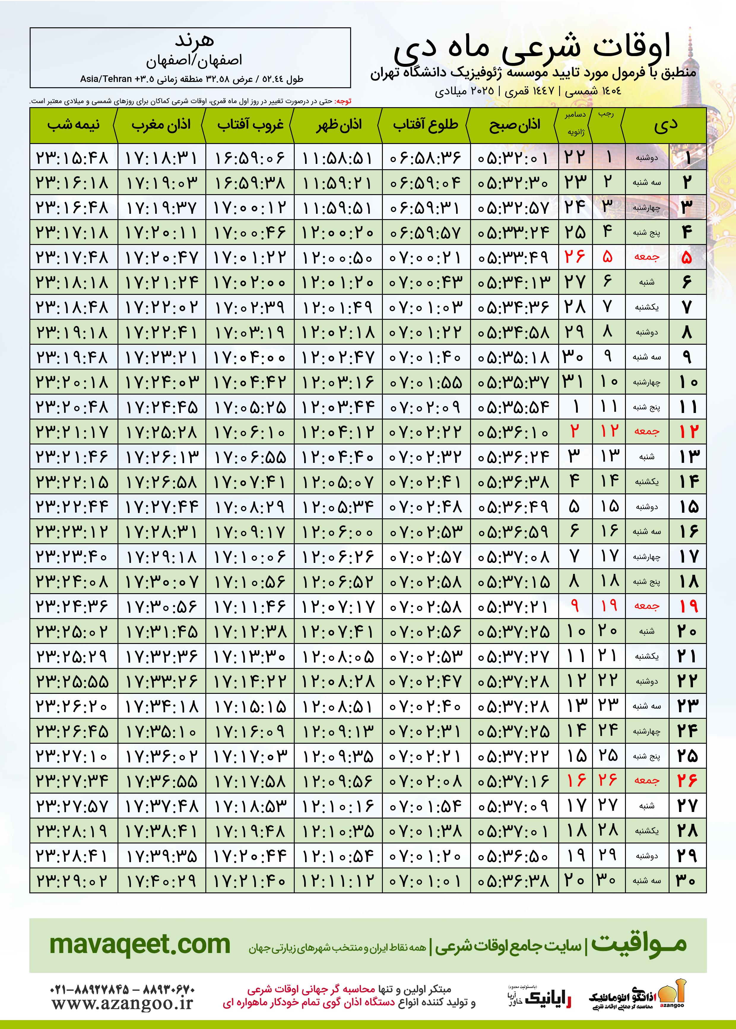 اوقات شرعی دی ١٤٠٤ شمسی شهر هرند