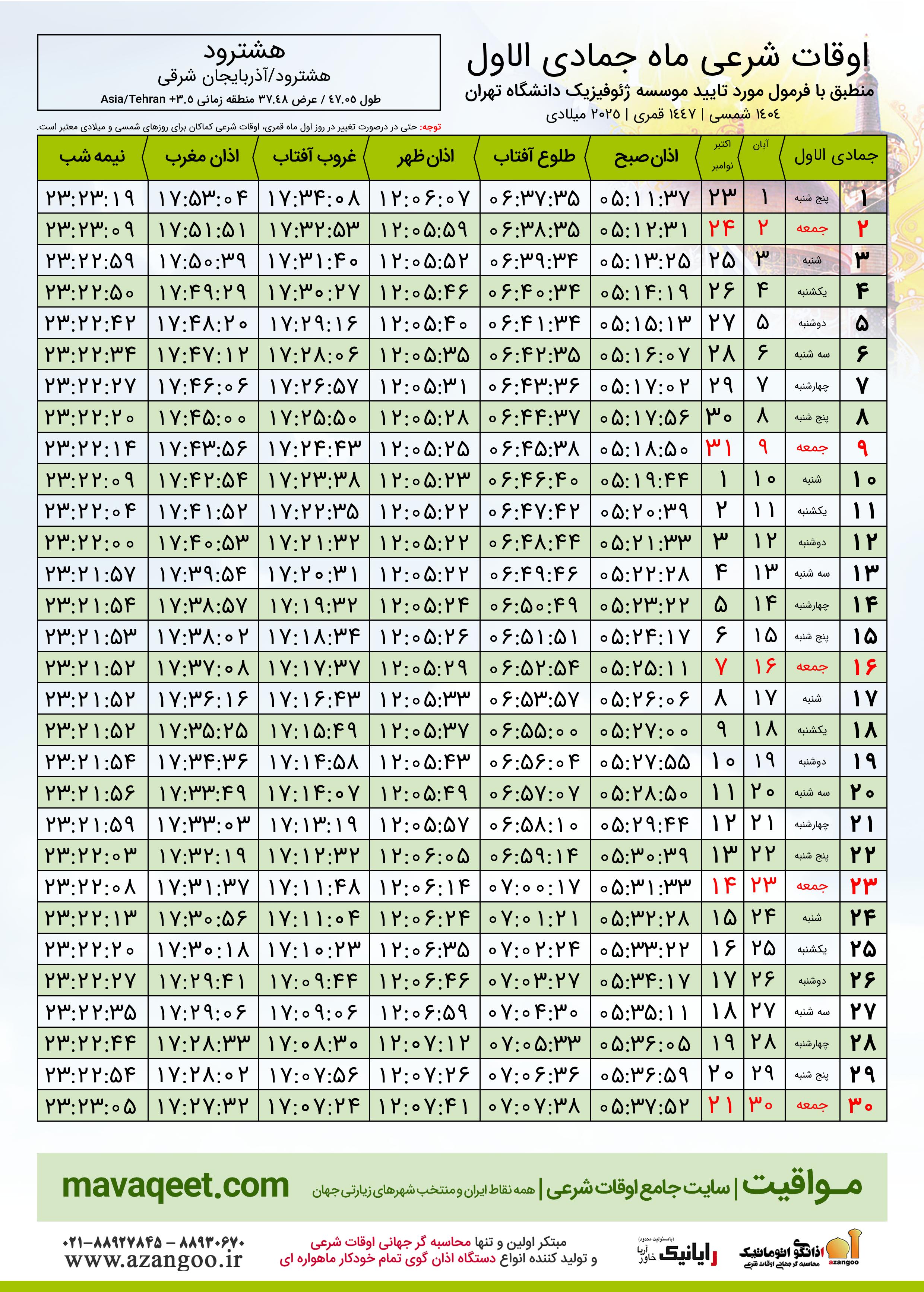 اوقات شرعی ماه جمادی الاول ١٤٤٧ هـ.ق شهر هشترود بر
