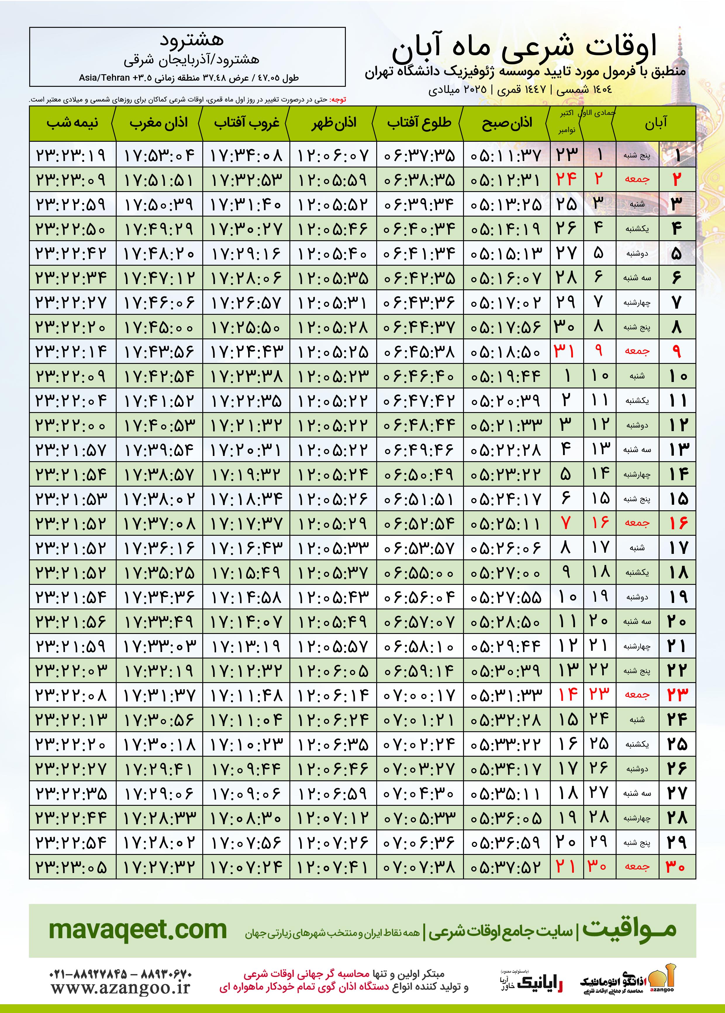 جدول اوقات شرعی آبان ١٤٠٤ شمسی شهر هشترود