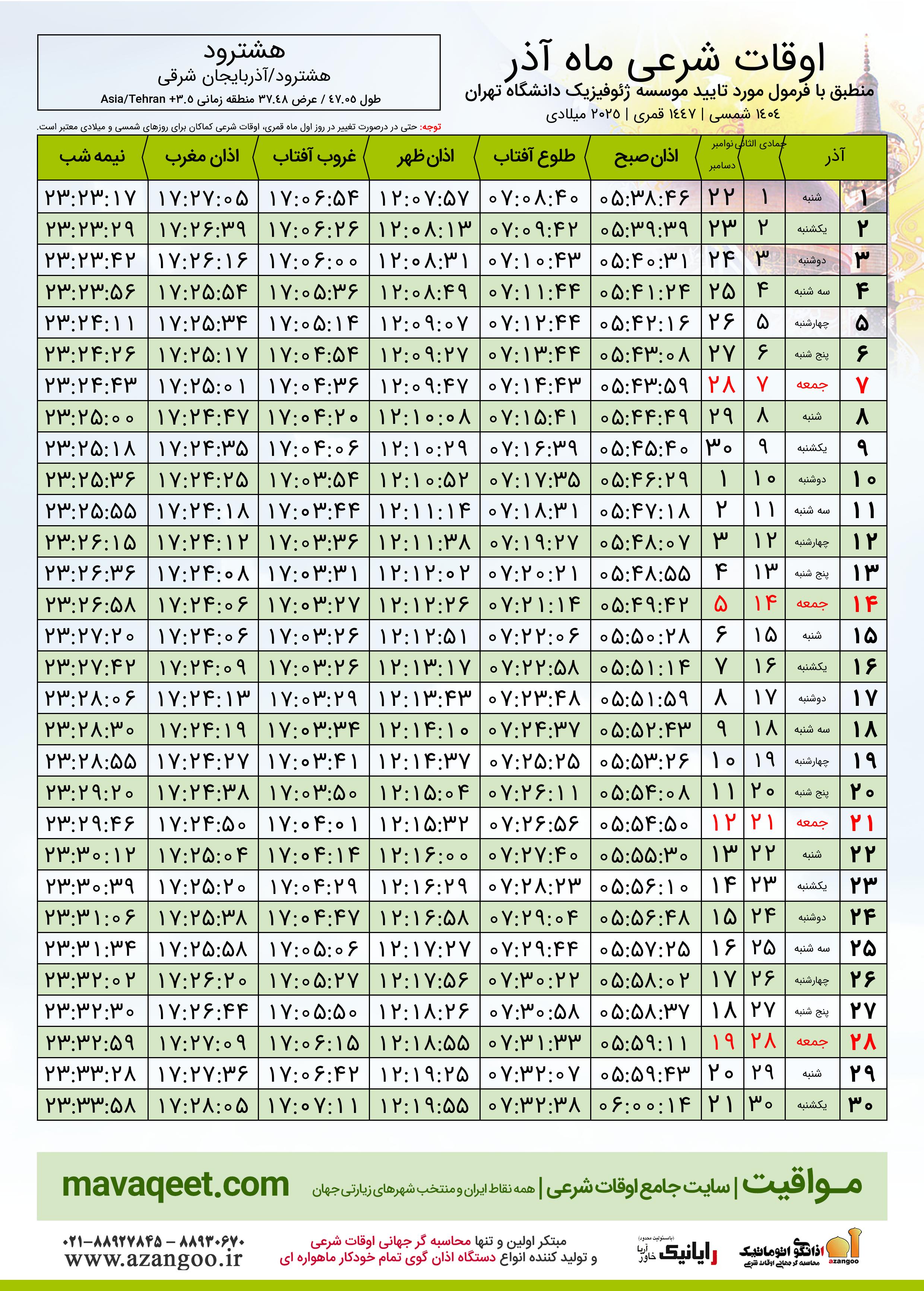 دانلود اوقات شرعی آذر ٠٤ - ١٤٠٤ شهر هشترود