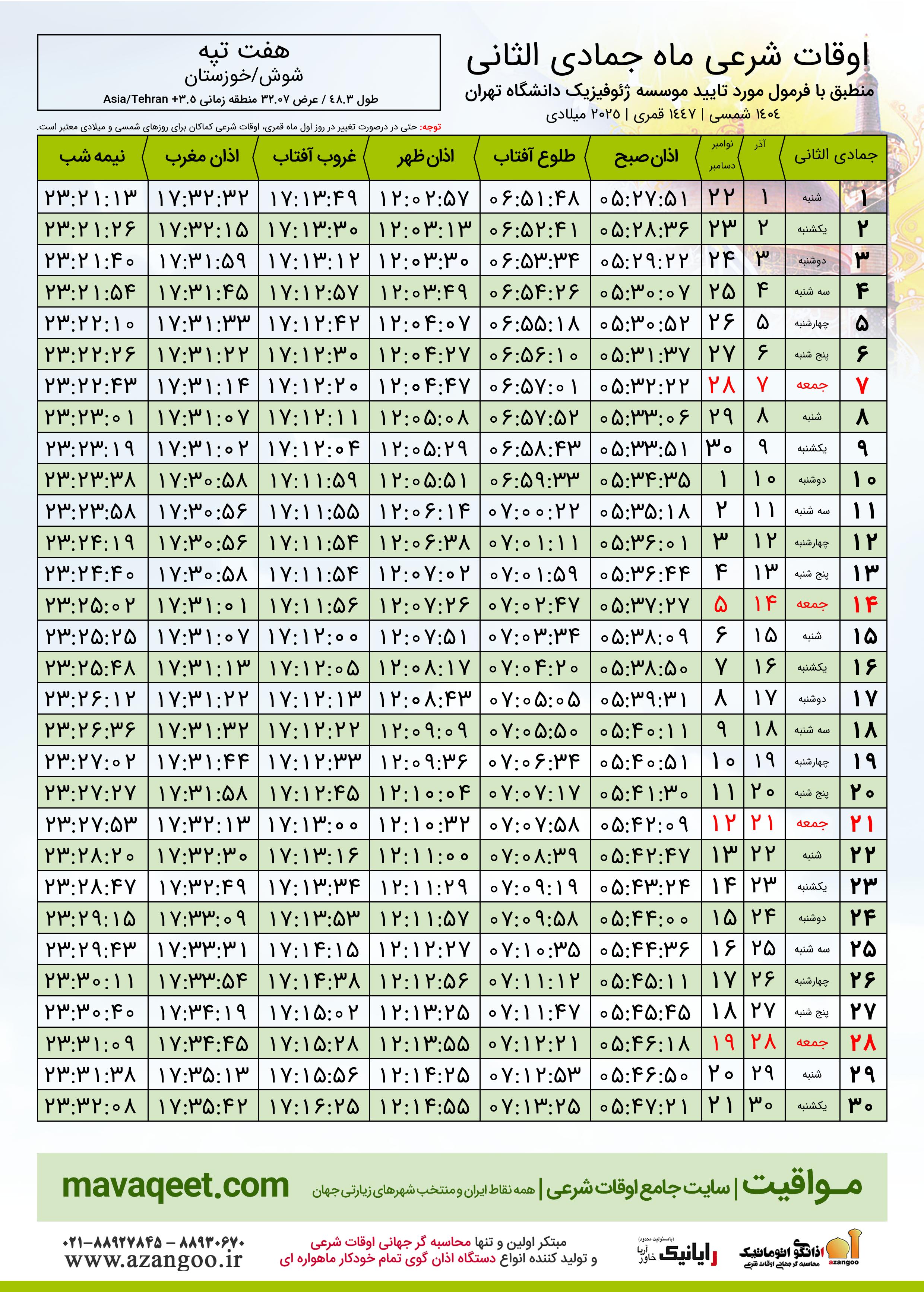 جدول اوقات شرعی جمادی الثانی ١٤٤٧ قمری شهر هفت تپه