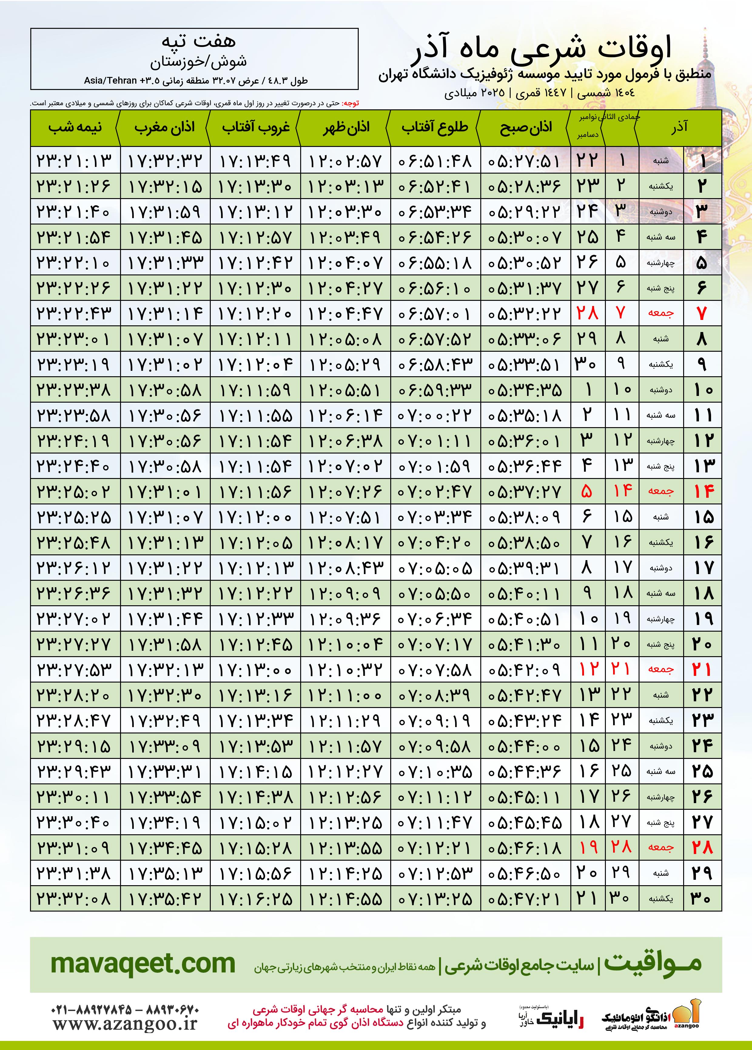 جدول اوقات شرعی آذر ١٤٠٤ شمسی شهر هفت تپه