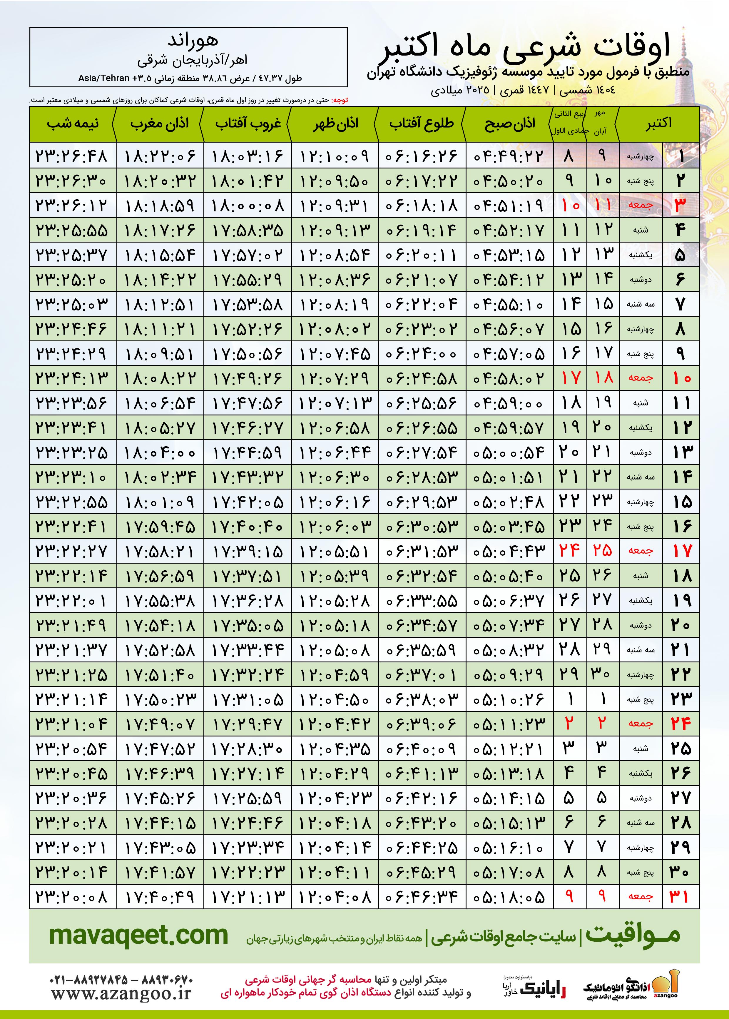 جدول اوقات شرعی اکتبر ٢٠٢٥ میلادی شهر هوراند