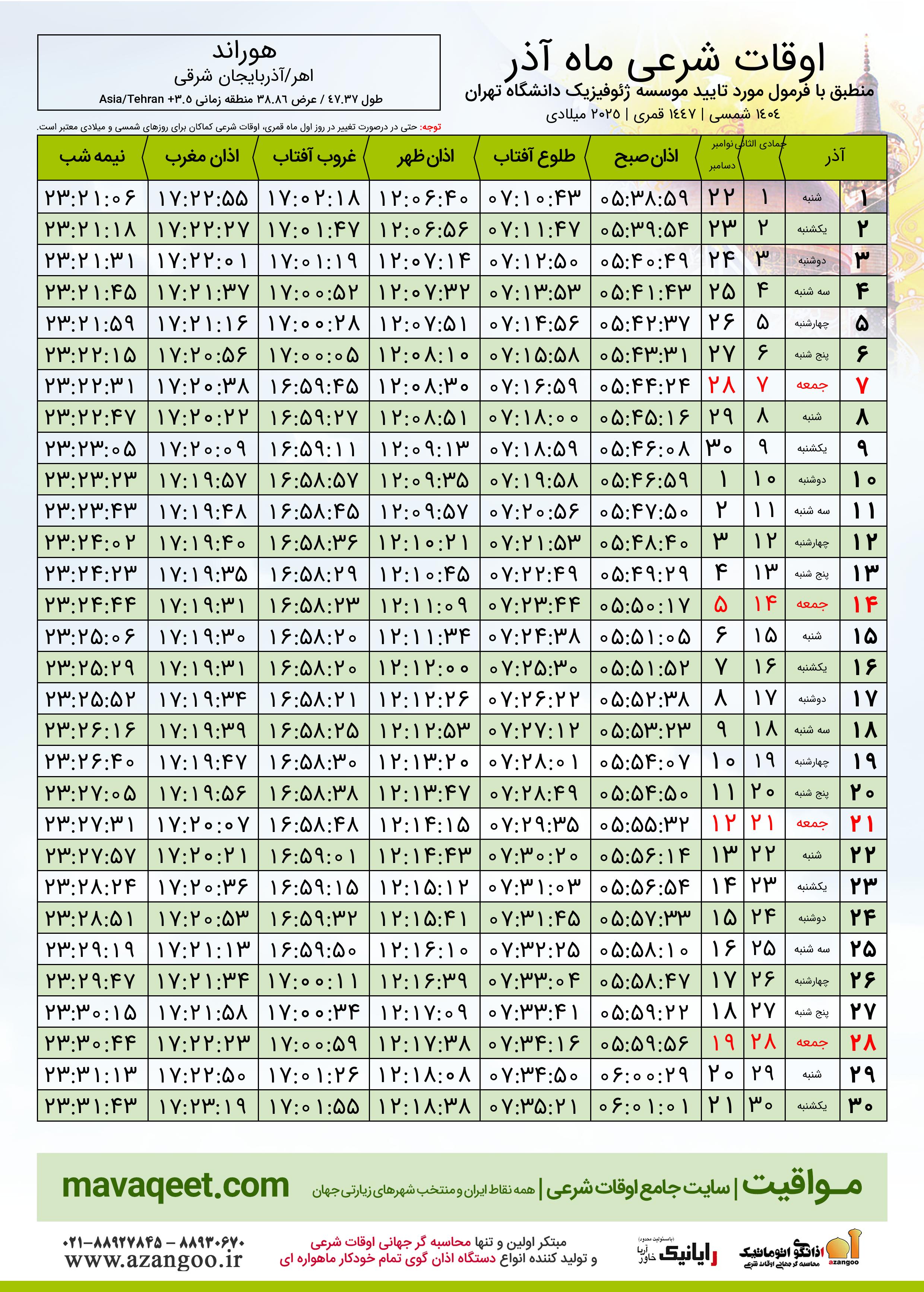 اوقات شرعی آذر ١٤٠٤ شمسی شهر هوراند