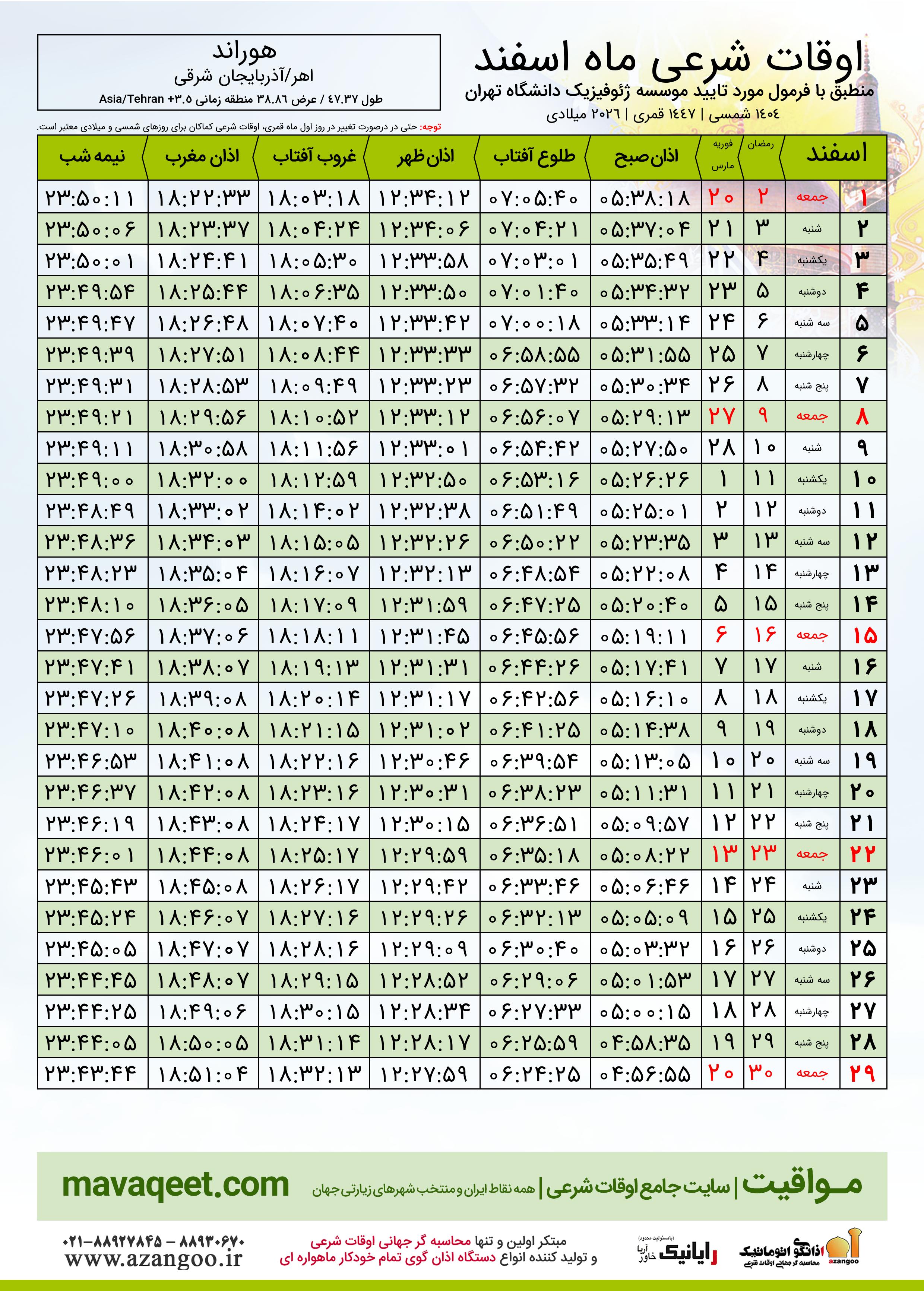 اوقات شرعی ماه رمضان شهر هوراند ١٤٠٤ - ٠٤ شمسی | ٢٠٢٦ میلادی