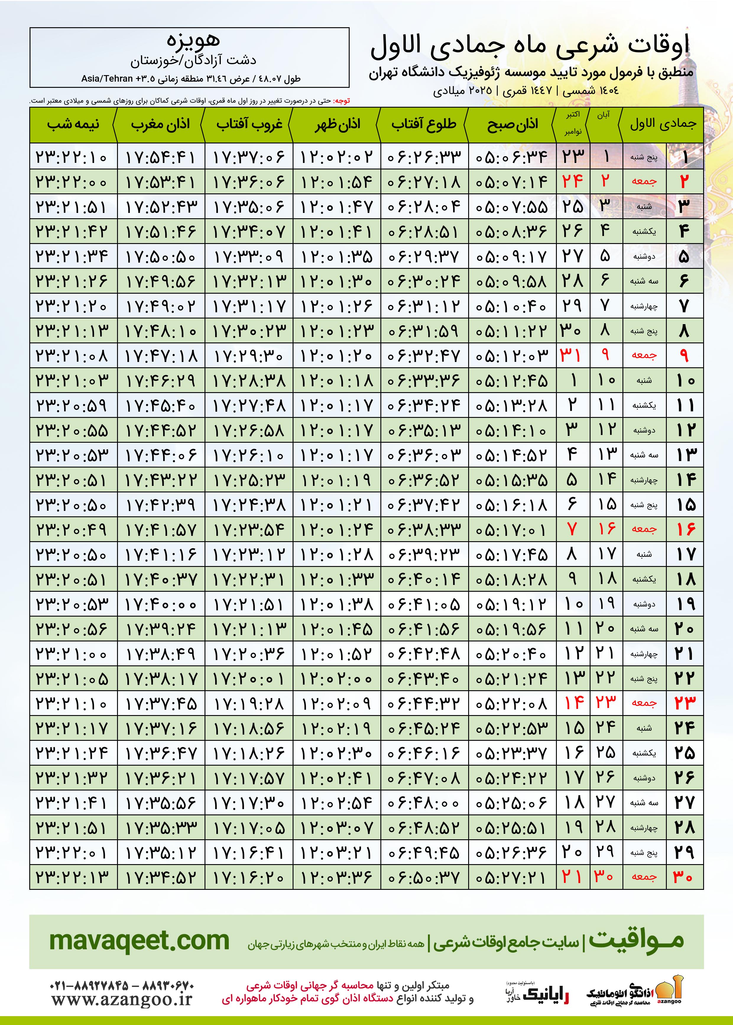 جدول اوقات شرعی جمادی الاول ١٤٤٧ قمری شهر هویزه