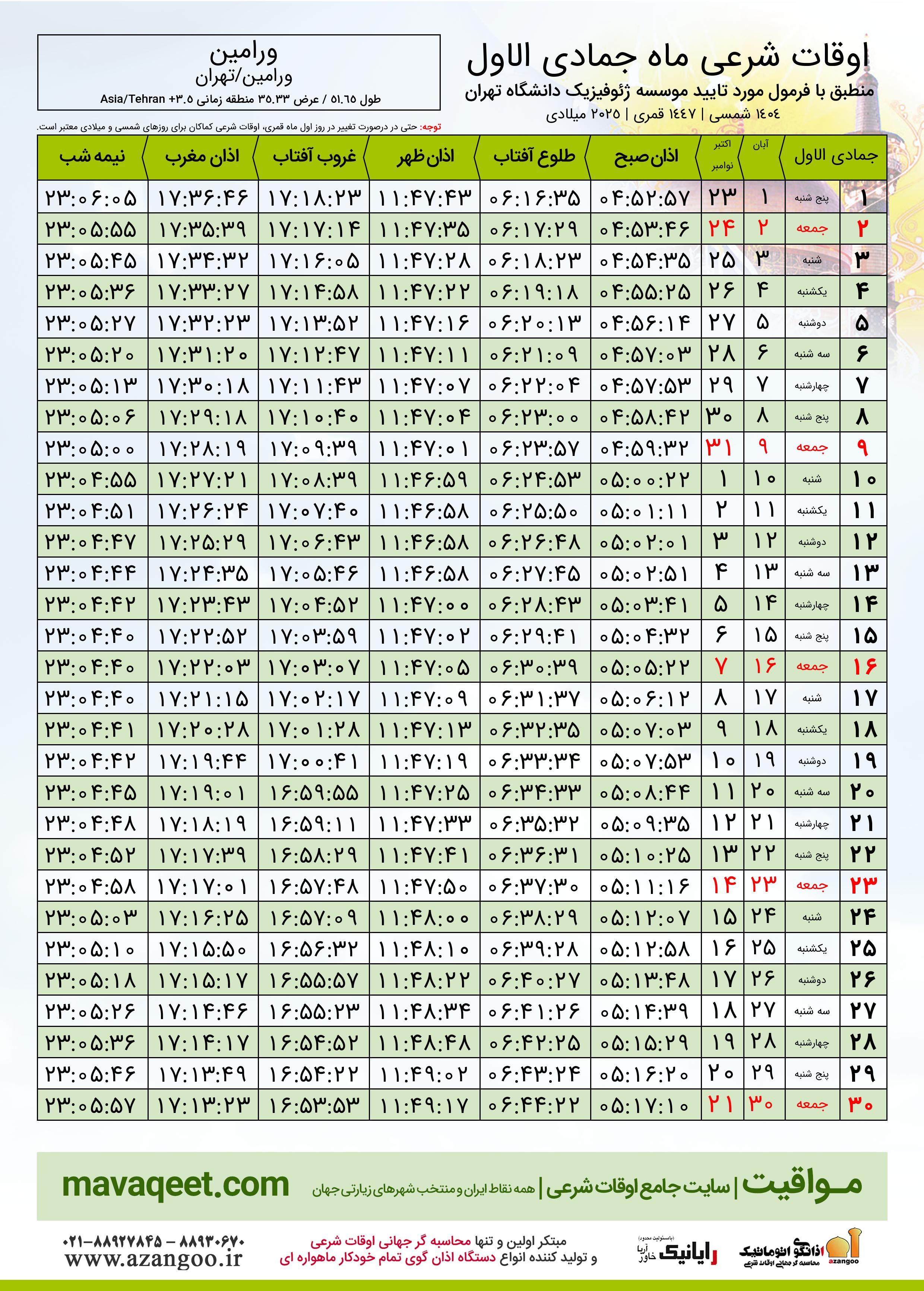 جدول اوقات شرعی جمادی الاول ١٤٤٧ قمری شهر ورامین
