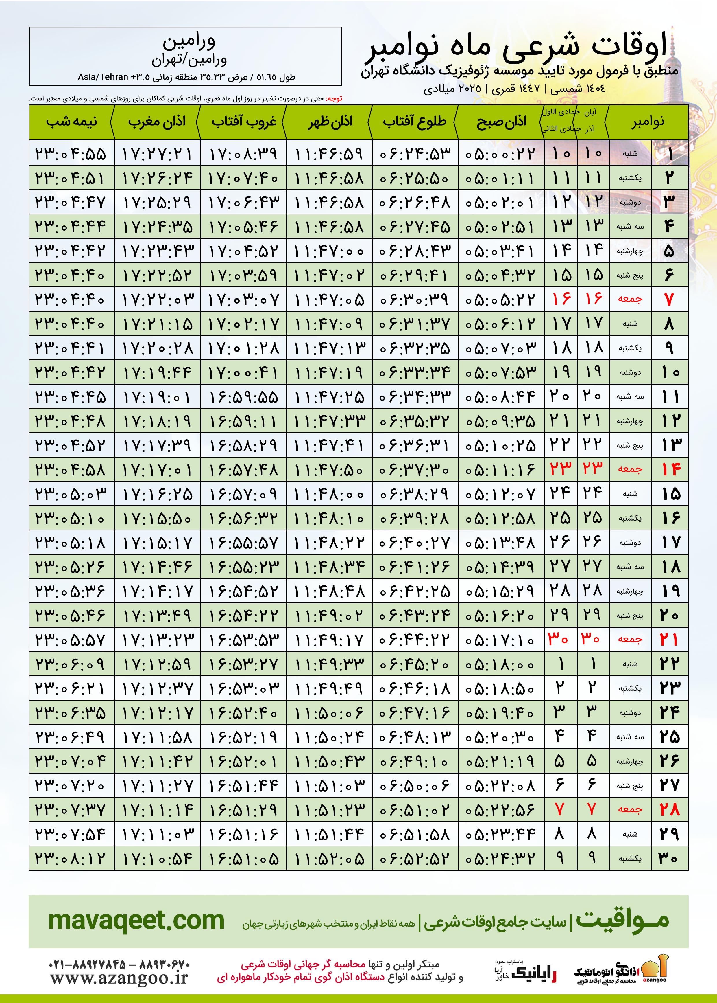 دانلود اوقات شرعی نوامبر ٢٠٢٥ شهر ورامین