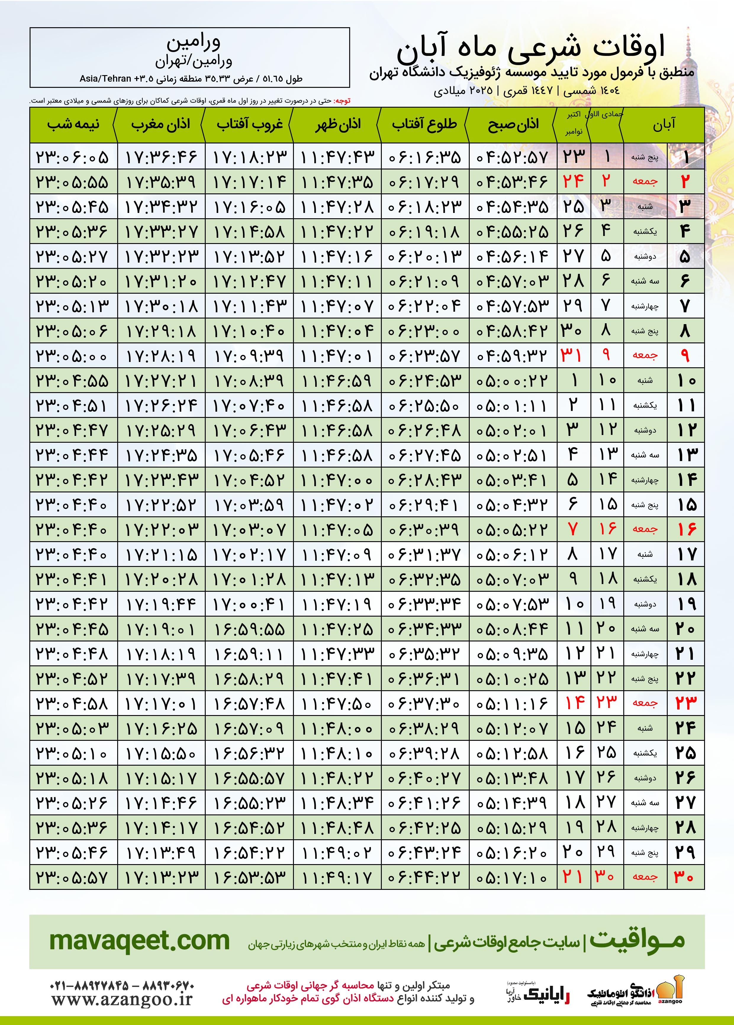 جدول اوقات شرعی آبان ١٤٠٤ شمسی شهر ورامین