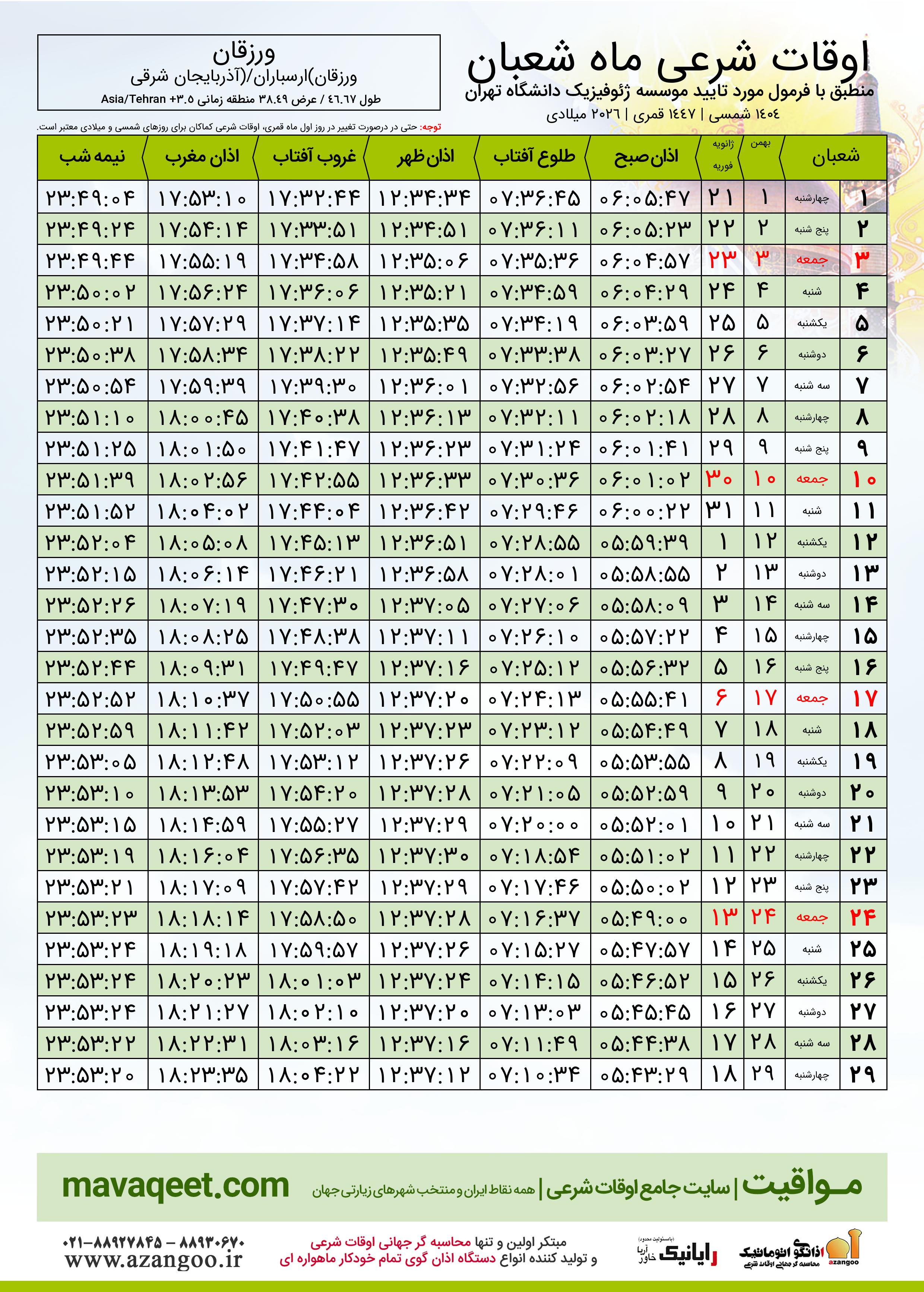 جدول اوقات شرعی شعبان ١٤٤٧ قمری شهر ورزقان