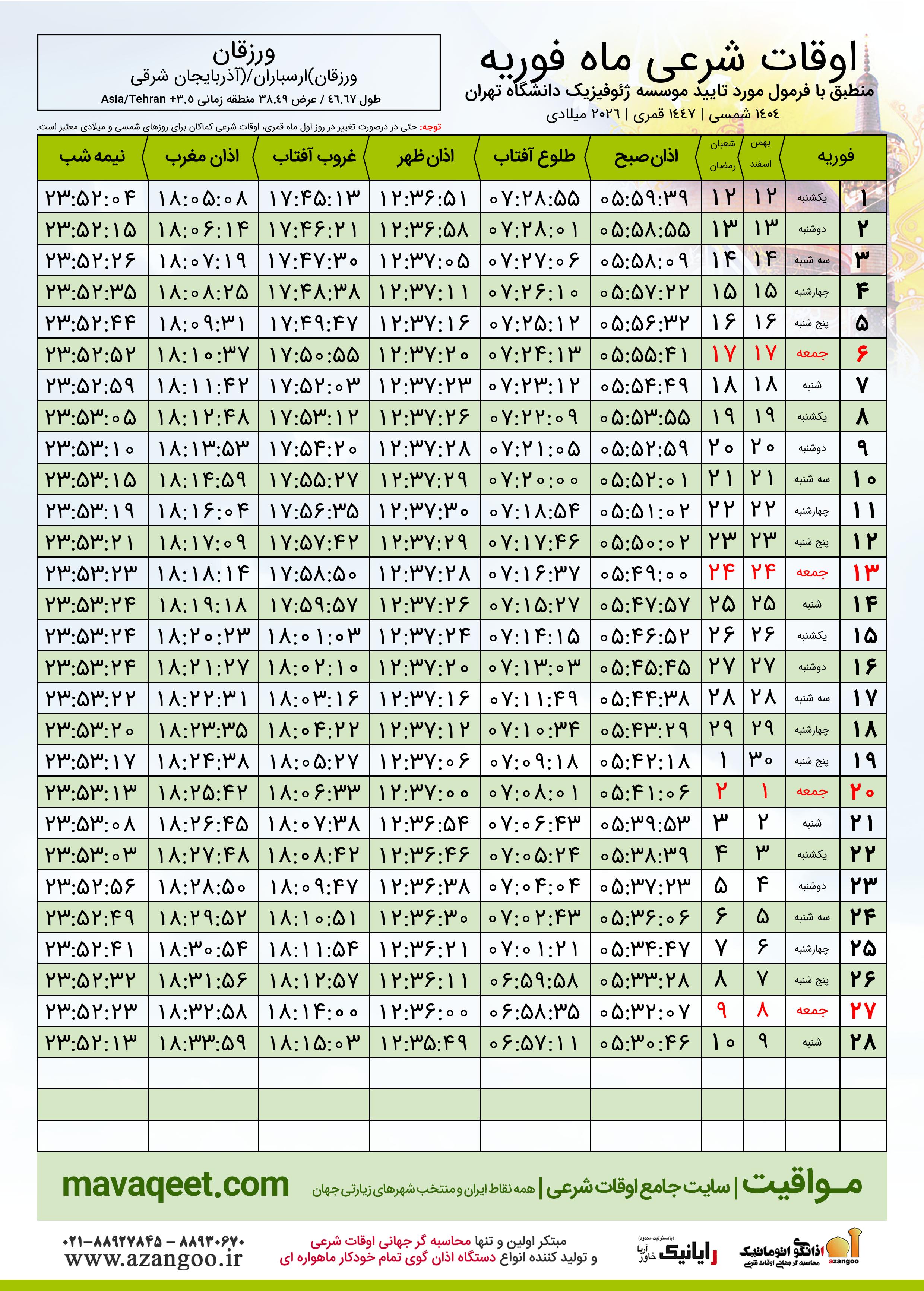 اوقات شرعی ماه رمضان شهر ورزقان ١٤٠٤ - ٠٤ شمسی | ٢٠٢٦ میلادی